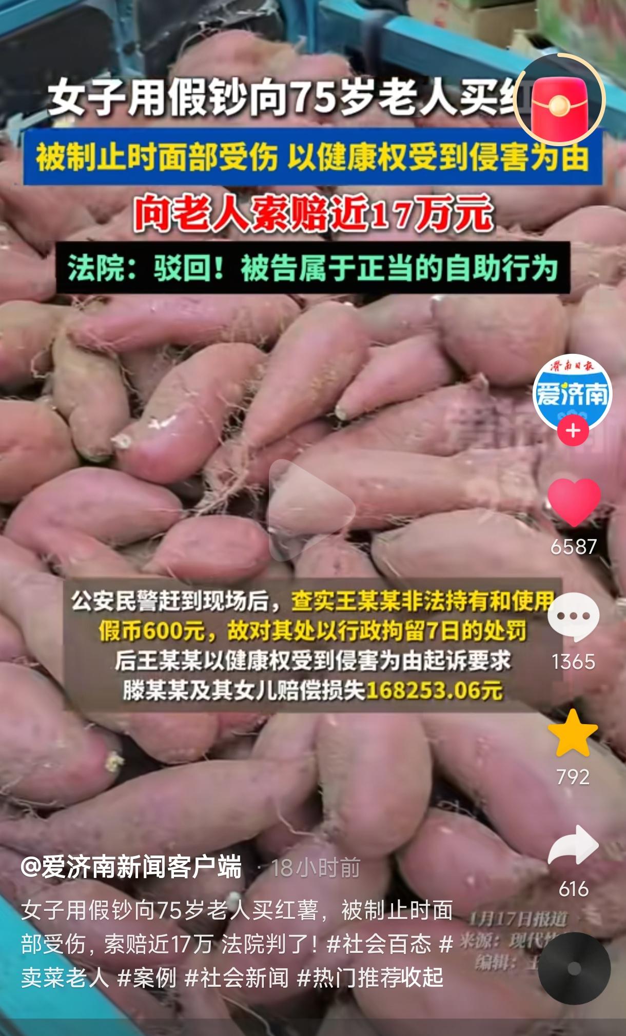 南京,75岁老人卖红薯,一女子用假币购买老人红薯。几天后,女子再次去老人摊前买红薯,被老人及其女儿认出,在把她扭送去派出所的过程中,致女子面部受伤。民警到场后,查实女子非法使用假币600元,对她拘留7日。事后,女子起诉到法院,要求卖红薯老人和其女儿赔偿她损失168253.06元。 南京浦口的一处农贸市场,清晨起就满是烟火气,75岁的滕某某常年守在这里摆摊,靠着卖些红薯、农副产品糊口,日子过得紧巴巴的。   2023年2月17日一早,滕某某和女儿依旧准时出摊。   刚把红薯摆好没多久,一名女子快步走了过来,她裹得严实,头上戴着头盔,脸上还遮着口罩,只露一双眼睛,上来就问红薯多少钱一斤。   女子挑了几个红薯,低头从包里翻出钱包准备付钱。   就是这个钱包,让滕某某瞬间警觉起来,两天前,就是同一个人、拿着这个钱包,用一张假币骗走了他大半天的收入。   上次被骗后,滕某某把那张假币攥在手里,夜里都睡不着觉。   确认眼前这人就是骗自己的人,滕某某没半分犹豫,伸手就抓住了女子的手腕,不让她走。   女儿见状也立刻上前牵制,同时赶紧掏出手机打了报警电话,生怕一松手人就跑了。   女子见身份被戳穿,顿时慌了神,一个劲地扭动身体想要挣脱,手脚乱挥着抗拒。   混乱的拉扯中,女子的脸部不小心蹭到了旁边的摊位边缘,擦破了一点皮,只是轻微的皮外伤。   民警赶到后,经过初步询问和核查,民警从女子身上搜出了600元假币,确认该女子姓王,已经多次用假币欺瞒摊贩。   王某某非法持有、使用假币的行为已经违反了相关法律法规,警方当即作出决定,对她处以7日行政拘留。   滕某某父女觉得这事已经有了公正处理,便收拾好摊位继续忙活,没再把这事放在心上。   可平静的日子没过多久,几个月后的一天,一封法院传票寄到了滕家。   滕某某父女拆开一看,整个人都愣住了,起诉他们的不是别人,正是刚被拘留过的王某某。   王某某在诉状里说,自己被滕某某父女拉扯致伤,身体健康受到了侵害,要求二人赔偿医疗费、误工费、营养费等一系列费用,加起来足足有168253.06元。   靠着摆摊赚点小钱的滕家,根本承受不起这么高的赔偿,父女俩又气又无奈,明明是自己被欺骗,反倒成了被告,典型的恶人先告状。   南京市浦口区人民法院接手案件后,调取了事发时的监控录像,询问了市场周边的目击者,把整个事件的细节捋得清清楚楚。   法院认为,滕某某的合法财产先被王某某用假币侵害,再次相遇时情况紧迫,若不及时控制王某某,对方很可能再次逃脱,无法追究责任。   滕某某父女的拉扯、控制行为,目的是为了留住侵权人等待警方处理,而且在控制对方后第一时间报了警,完全符合自助行为的法律要求。   至于王某某的面部轻微伤,是她为了逃避追责强行挣扎导致,并非滕某某父女故意殴打所致,两人的行为没有超出必要的维权范围。   综合所有事实和法律依据,法院最终作出判决,驳回王某某的全部诉讼请求,这份判决生效后,双方都没有提出上诉。   更巧的是,判决书送达的日子是2024年12月31日,刚好是滕某某75岁的生日,这份胜诉判决成了最珍贵的生日礼物。   滕某某拿着判决书,积压多日的情绪终于释放,和女儿紧紧抱在一起,压在心里的大事总算有了公正结果。   令人惋惜的是,滕某某在2025年4月不幸病逝,生病卧床期间,他还时常念叨着这起案子,好在最终等到了公道,没有留下遗憾。   这份判决没有含糊其辞,清晰划分了合法维权与侵权的边界,不让守法者寒心,也不让不法分子有机可乘。   作为南京法院2025年度十大典型案件之一,它也给普通人提了个醒,面对不法侵害时,合理范围内的自助维权会得到法律支持。   法律对滕某某父女正当维权的认可,本质上是在明确是非导向,不让“恶人先告状”的闹剧得逞。   王某某用假币欺骗高龄老人本就有错,受罚后还妄图索要赔偿,最终只能自食苦果,为自己的不法行为付出代价。   而滕某某父女面对侵害不退缩,用合理方式守护自身权益,这份朴素的正义,终究被法律稳稳接住。