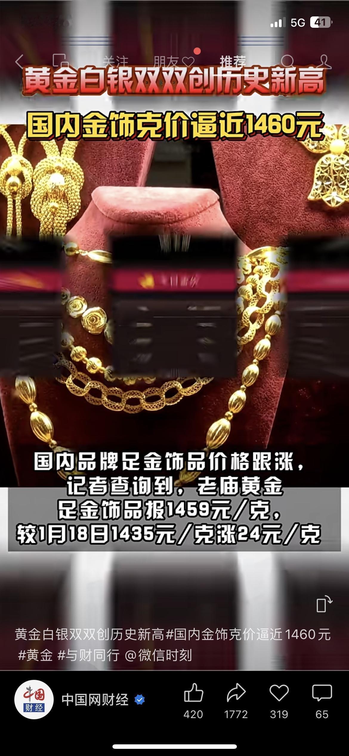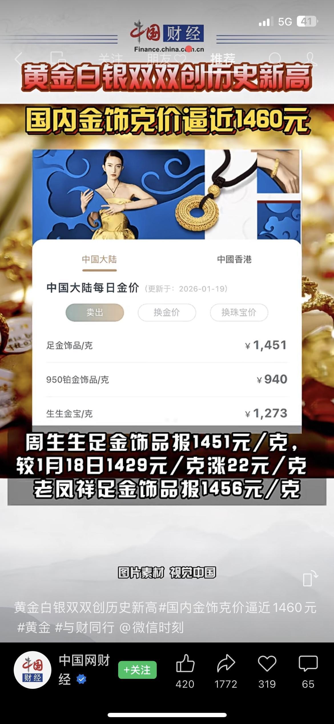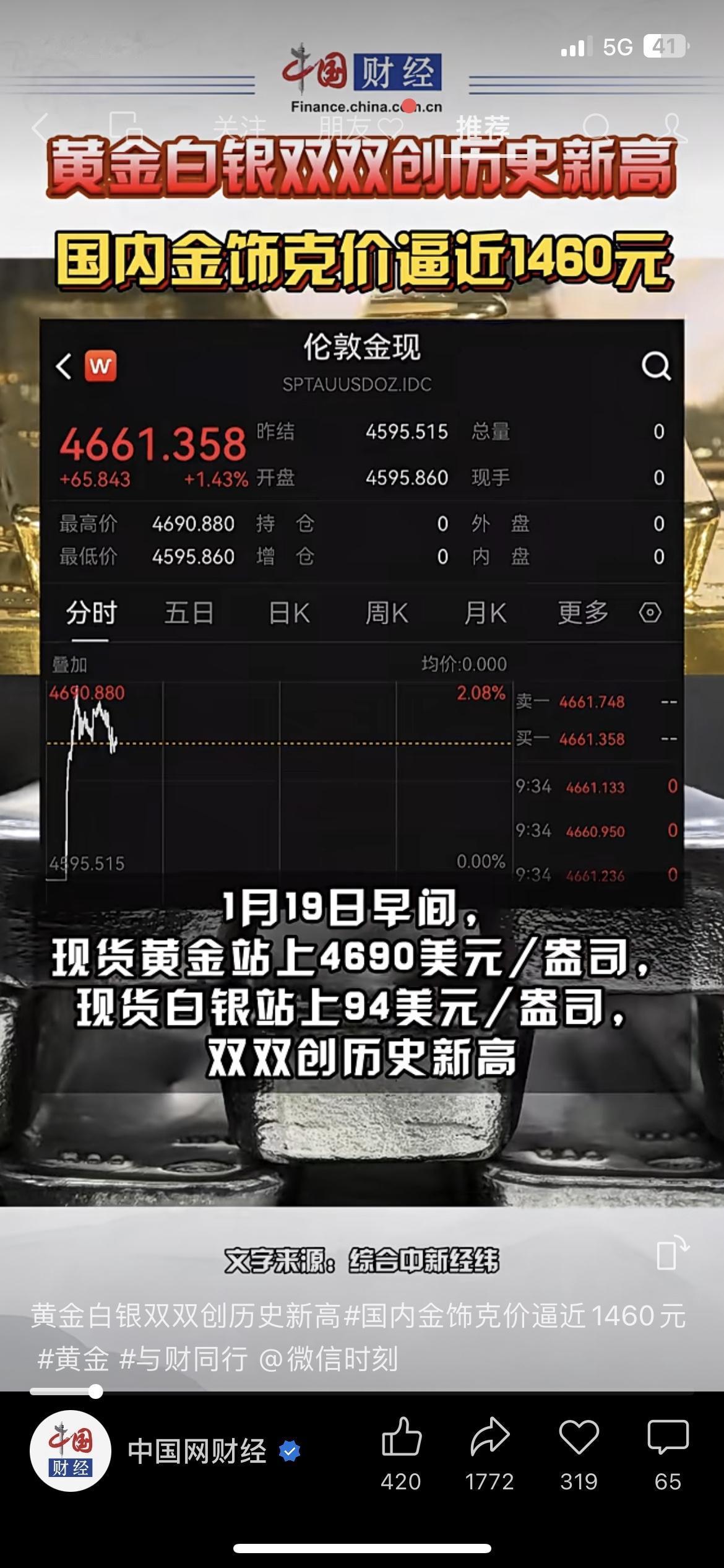 炸锅!黄金白银双双创新高!金饰克价逼近1460! 1月19日早间,现货黄金站上4690美元/盎司,白银站上94美元/盎司,国内金饰克价逼近1460元!我同事上周买的黄金基金,现在赚了12%,说“早知道多买一点”。懂的都懂,贵金属波动大,普通人别追高。 黄金不是保险箱,是考验心态的照妖镜。 市场有风险,投资需谨慎。 你会追高买黄金吗?是果断上车,还是持币观望? 真金白银 财经热点