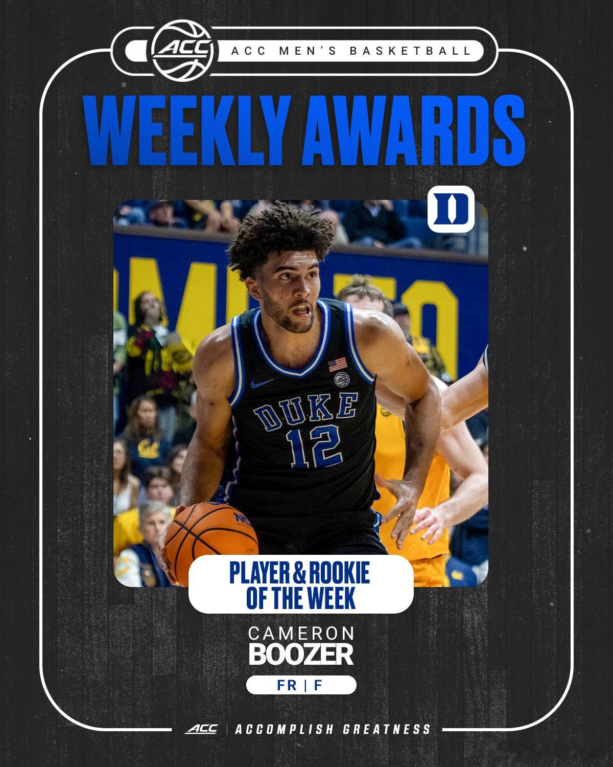 ACC联盟第11周表现奖(2025-2026赛季)。NCAA男篮 最佳球员+最佳新生:Cameron Boozer。NCAA女篮 最佳球员:Imari Berry,最佳新生: Uche Izoje。
