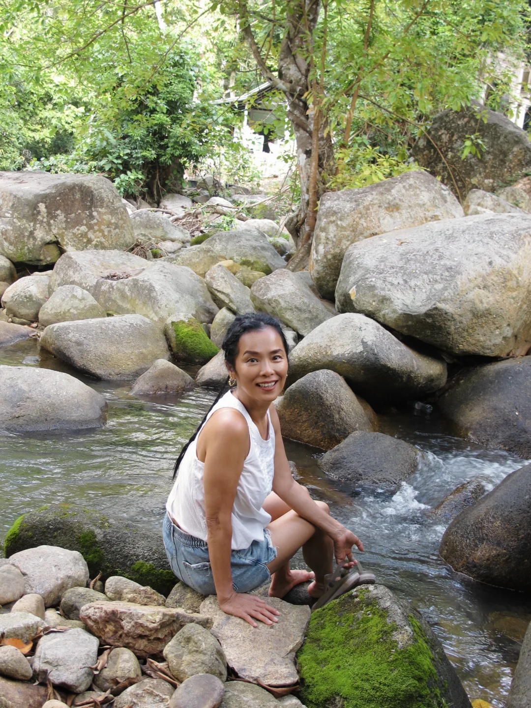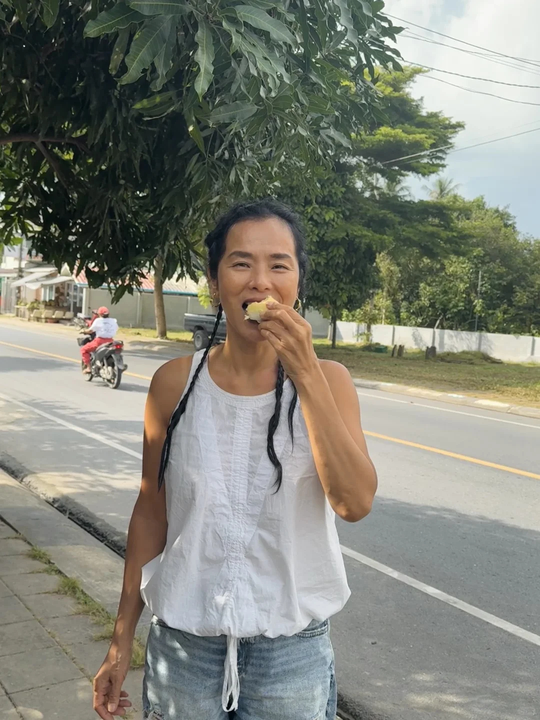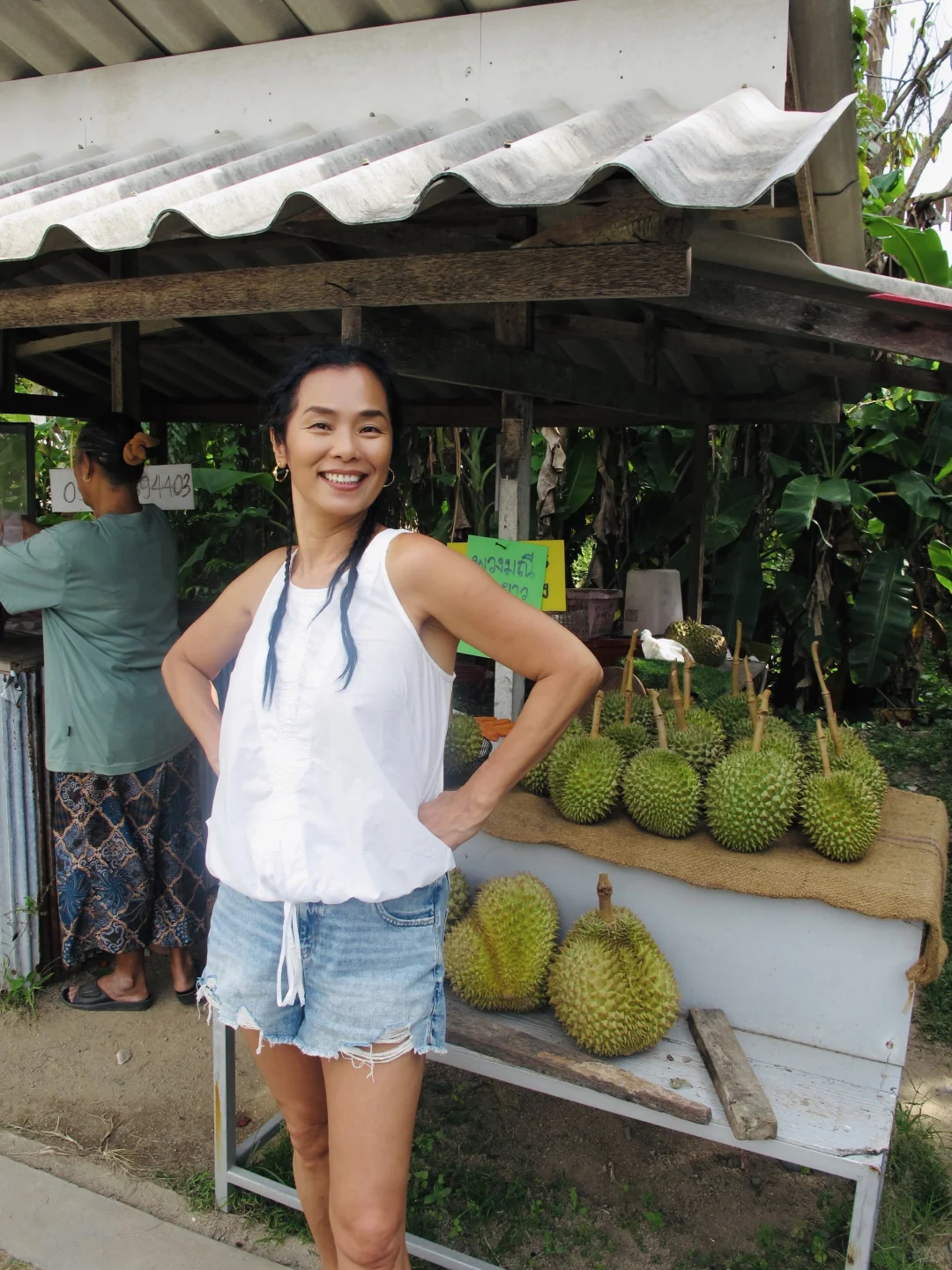 韦唯泰国度假,自然松弛,充满活力。韦唯很爱吃榴莲。
