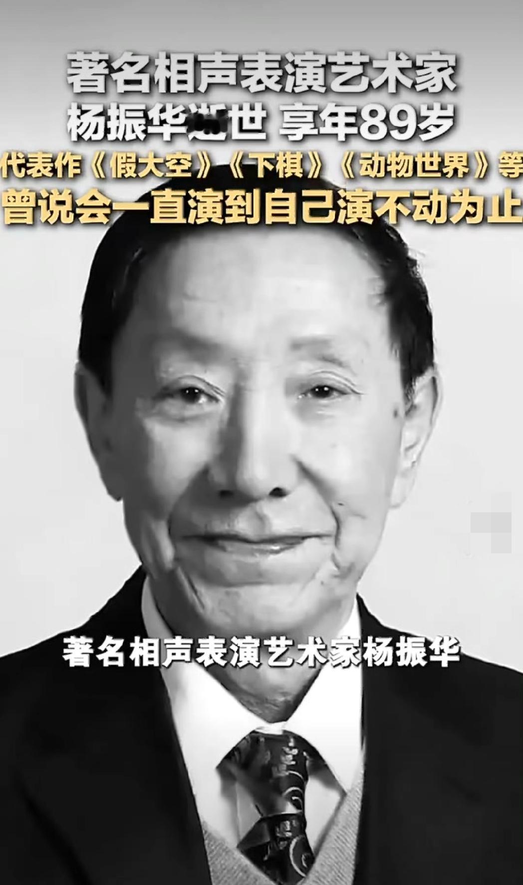 哭了!90岁相声泰斗杨振华走了,《假大空》再也等不到新续集了 2026年1月19日,沈阳传来噩耗,著名相声表演艺术家杨振华先生溘然长逝,享年90岁!这个把讽刺相声说进人心坎里的老爷子,终究还是带着他的幽默离开了我们。 提到杨振华,谁没听过《假大空》?当年那句犀利吐槽,又好笑又解气,小时候跟着收音机笑到拍大腿,长大再听才懂里面的深意,这就是老艺术家的功力!他不光敢说真话,还敢创新,首创的“吉他相声”把洋乐器融进传统曲艺,在上世纪八十年代妥妥是“顶流操作”,让沈阳相声和北京、天津三足鼎立,成为一代人的青春记忆。 从公安系统文艺汇演冠军到牡丹奖终身成就奖,老爷子一辈子扎根舞台,83岁还登台演新作,教徒弟、守小剧场,把“说真话、演实事”刻进了骨子里。如今大师落幕,但《下棋》《动物世界》这些经典永远不过时,那些穿越时光的笑声也不会消失。 你小时候是不是也搬着小板凳守过他的相声?最难忘杨振华先生的哪个名场面?来评论区聊聊你的回忆,一起缅怀这位又敢说又会逗的相声泰斗~ 相声泰斗杨振华逝世 沈阳相声的黄金时代