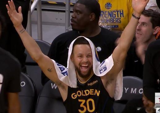 库里真是太开心了! 今天对阵热火队的比赛,在巴特勒因伤提前退赛,库里身背5次犯规无奈下场的情况下,替补席上的波杰姆斯基和希尔德接连发力,分差不仅没有缩小,反而越来越大,这可把板凳席上的库里给乐坏了,振臂高呼、满脸笑容的为场上的球员呐喊庆祝。 本场比赛,勇士队多达7人得分上双,其中替补席合计得到了66分,有3人得分上双,波杰姆斯基得到了全队最高的24分6篮板4助攻,希尔德也有16分4篮板2助攻入账。这就是库里所需要看到替补席的表现,勇士队如今在按照正确的方式打球,距离季后赛资格区已经越来越近了!