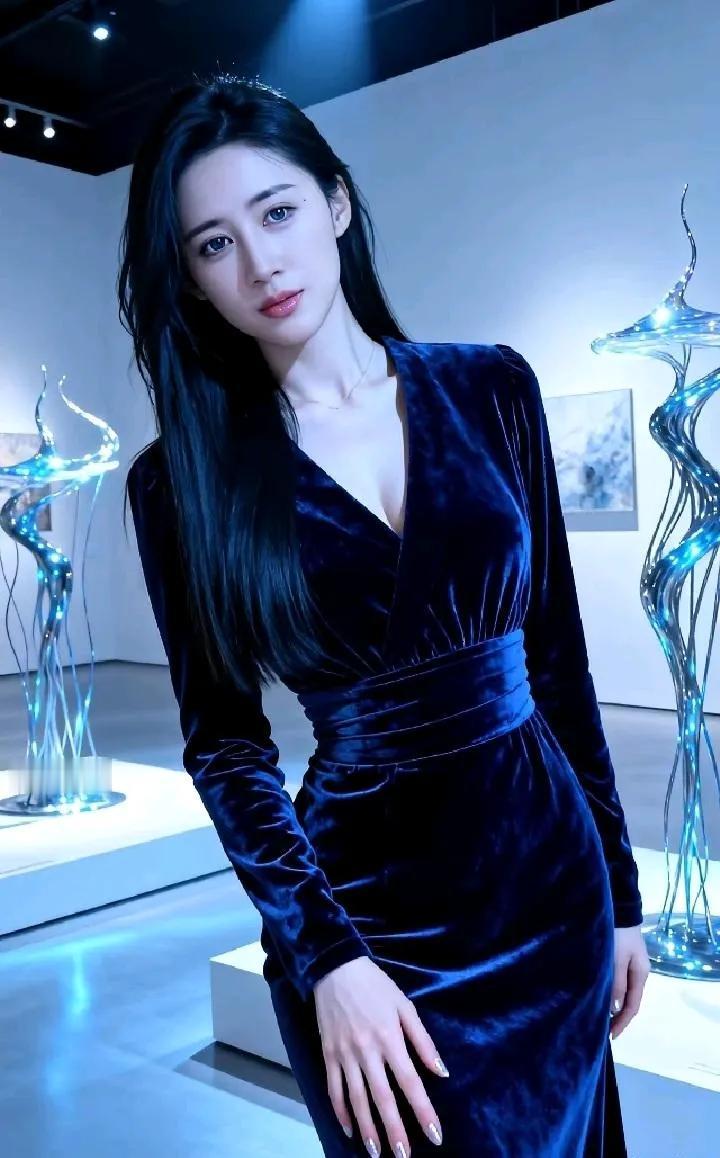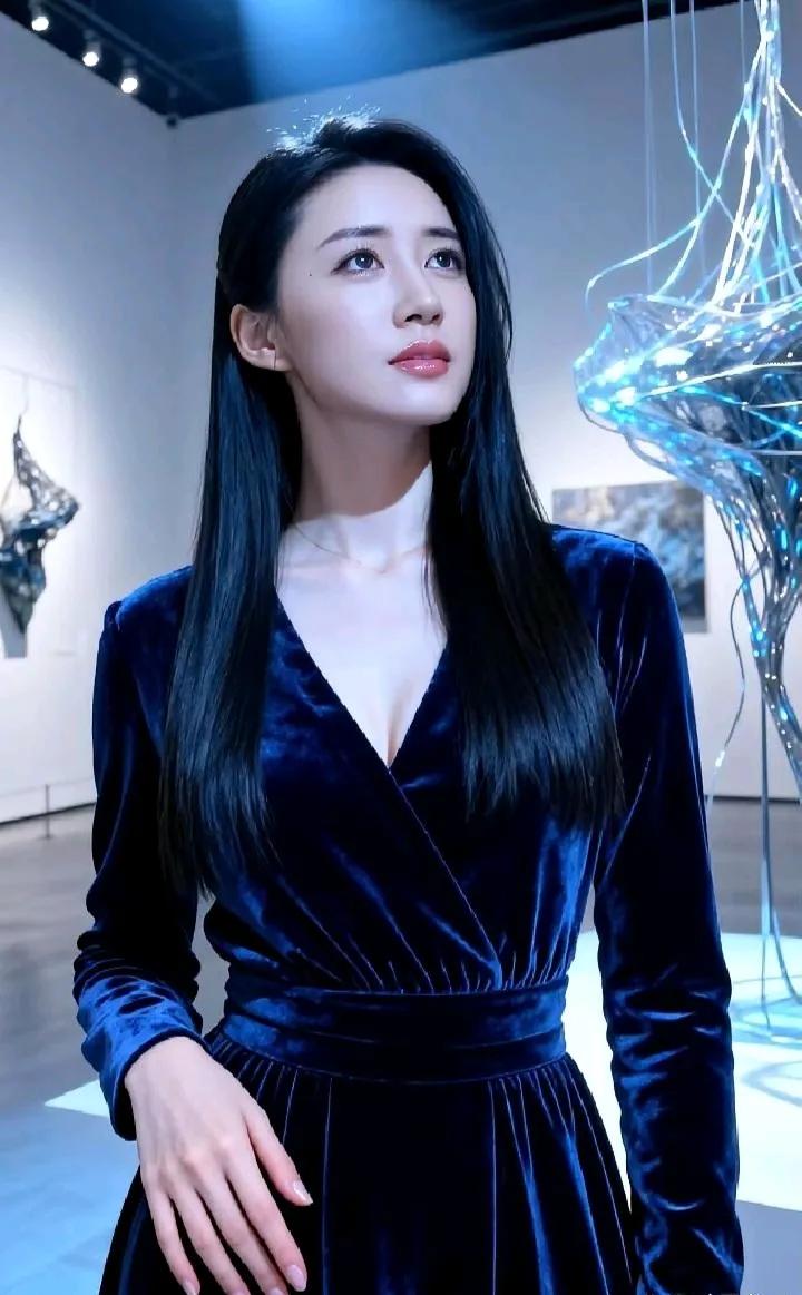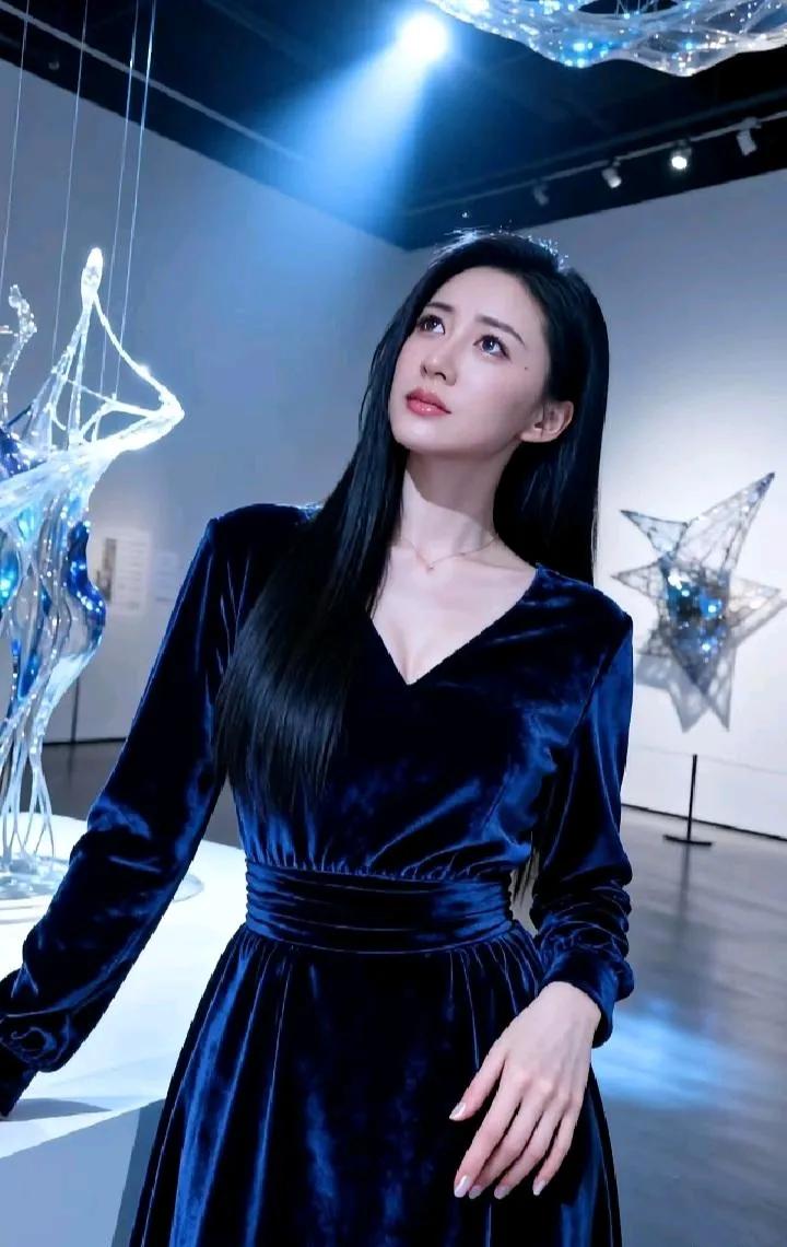 优雅蓝裙少女,置身现代艺术馆,感受艺术与美的交融。