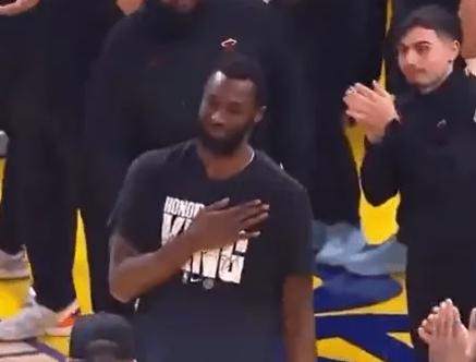 NBA常规赛,热火对阵勇士的比赛已经结束。 赛前,勇士主场为前勇士球员安德鲁-威金斯举办特殊的欢迎仪式,随后威金斯也向现场球迷挥手致意。 当勇士球迷起立为威金斯鼓掌时,诺曼-鲍威尔对他说:“别哭。” 本赛季,威金斯场均得到15.8分4.9篮板2.9助攻。