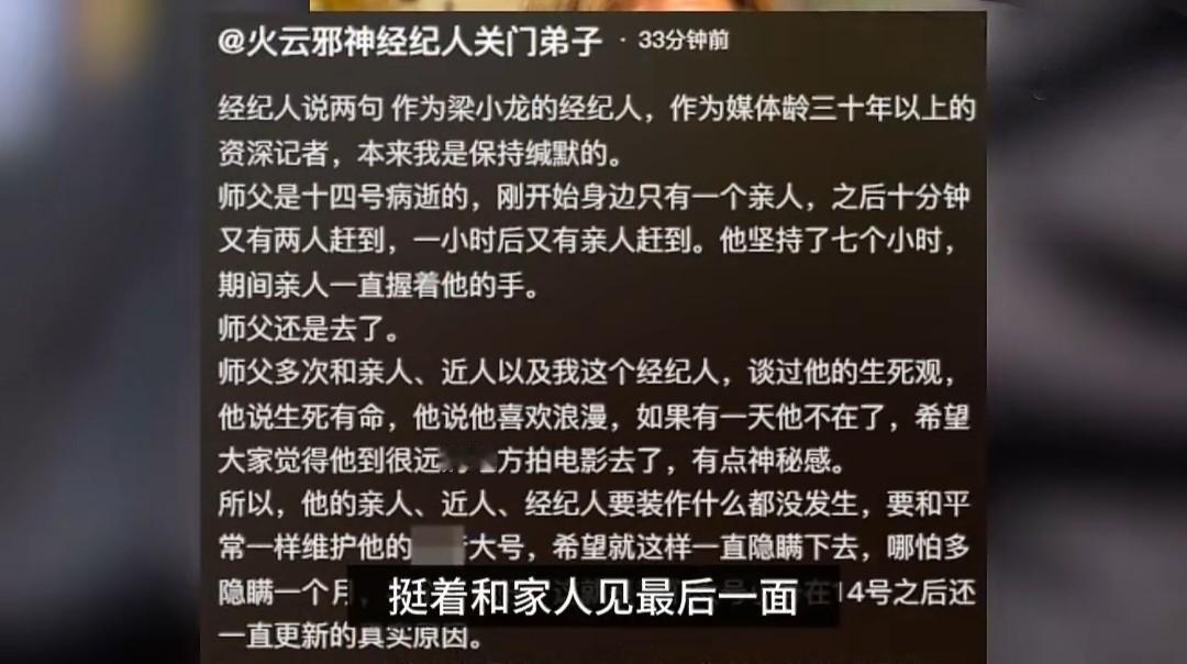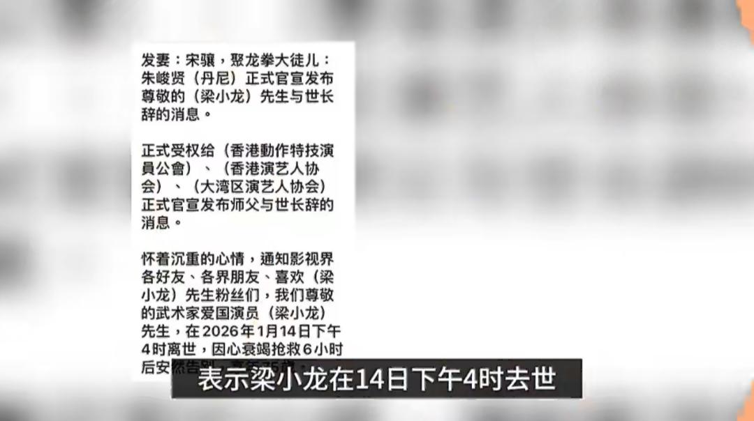 75岁火云邪神-梁小龙死因曝光,生前最后细节曝出后太戳人了。 当时看到这个消息,真的忍不住红了眼眶——那个演活了陈真、火云邪神的梁小龙,就这么走了。 1月14号下午4时,他在深圳因心脏衰竭不幸离世,享年75岁,不是网传的77岁。家属澄清,之前百科说的1948年是错的,他实际是1951年生。最让人揪心的是,离世前一天他还在和朋友聚餐、参加活动、写书法,精神头特别好,谁能想到转天凌晨2点半就突发胸口剧痛,痛到面青唇白。 送医时他还清醒,早上6点甚至吵着要出院,可病情急转直下,抢救了6个小时还是没能留住。经纪人说,他硬撑着7个小时,就是想等亲人赶来见最后一面,最后却只有妻子和陆续后来的几个亲人陪在他身边,期间有亲人一直握着他的手,儿女远在澳洲没能及时回来。 更让人感慨的是,他生前就和家人说过,如果哪天走了,希望大家以为他“去远方拍电影了”,留个浪漫的念想。所以家属本来想瞒住死讯,继续更新他的账号,结果还是被提前曝光了。 从《大侠霍元甲》里踢碎“东亚病夫”牌匾的陈真,到《功夫》里“唯快不破”的火云邪神,他的角色刻在几代人的记忆里。如今突然谢幕,除了惋惜,更提醒我们:生命有时会很脆弱,心脏问题太隐蔽,不容忽视,尤其是中老年人,一定要多留意身体信号。 你最难忘他的哪个角色?欢迎评论区聊聊吧。“火云邪神”梁小龙去世 火云邪神 陈真