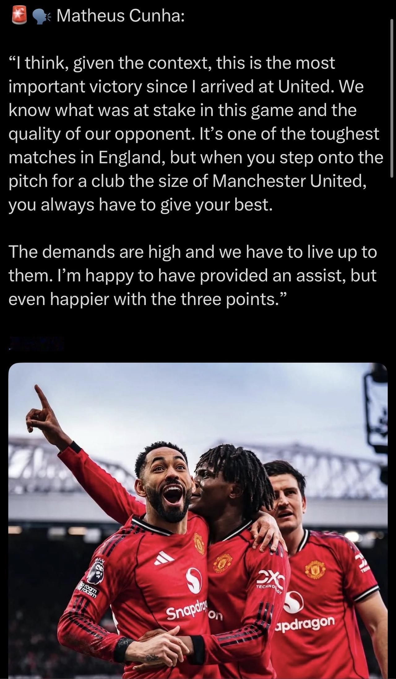 恢复自信很重要,但又要控制球员的多度自信,这就是弗格森后,曼联历任主帅想干,又干不好的工作! ……………………………………………………………… 马修斯·库尼亚: “我认为,就目前的情况来看,这是我来到曼联以来最重要的一场胜利。我们清楚这场比赛的意义以及对手的实力。这是英格兰最艰难的比赛之一,但当你代表曼联这样的大俱乐部踏上球场时,你必须始终全力以赴。” 要求很高,我们必须达到这些要求。我很高兴能贡献一次助攻,但更开心的是我们拿到了三分。
