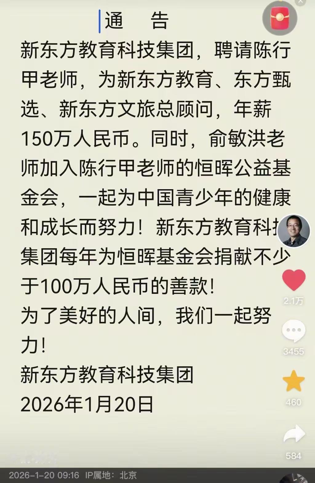 裸辞县委书记做公益的陈行甲,新岗位年薪150万! 公益人就该清贫度日?陈行甲70万年薪引争议才几天,新东方150万年薪的聘请通告直接引爆全网! 这位曾在巴东硬刚87名贪官的“全国优秀县委书记”,2016年裸辞投身公益时,谁也没想到他会陷入薪酬风波。恒晖基金会年报显示,他2024年税前收入73万,2023年更是90万,质疑声立马冒了出来:“做公益还拿这么多?” 老话讲“公道自在人心”,基金会账目清清白白过了审计,民政部门核实也没毛病。要知道陈行甲在深圳租房挤地铁,把18万美元奖金全捐了,多年来聚焦儿童大病救助,推动特效药进医保,帮全国患儿一年省下200亿。这样的实干派,拿合理薪酬本就该“物有所值”。 让人叫好的是,俞敏洪不仅给150万年薪,还带着新东方每年捐100万给恒晖公益,妥妥的“双向奔赴”。刚宣布从基金会“零薪水”交棒,就迎来新舞台,这波操作印证了“是金子到哪都发光”。 公益不是苦行僧的代名词,能者就该得相应回报。陈行甲用口碑和实绩站稳脚跟,这样的跨界合作,既让人才价值落地,又让公益力量续航,何乐而不为?