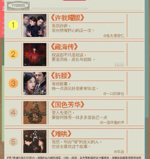 2025年热门剧集白敬亭的现偶还是太权威了 白敬亭的现偶还是太权威了,难哄和桑延拿下2025年热门剧集和年度十大角色,2025年热门剧集有:许我耀眼 、藏海传 、折腰 、国色芳华 、难哄 、白月梵星 、雁回时 、临江仙 、书卷一梦 、生万物 ~