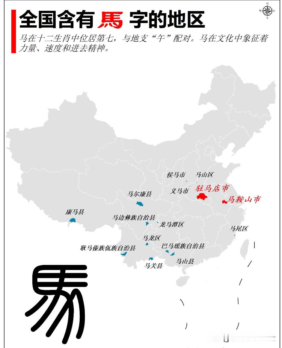 我国含有“马”字的地区 马在十二生肖中,位居第七,与地支“午”配对。根据《易经》,与“午”地支相关的卦象为“乾”,象征着强健与活力。马在文化中象征着力量、速度和进取精神。 我国共有15个地区含有“马”字,其中地级市2个,驻马店市、马鞍山市; 区县有13个,分别是马尾区、马山县、巴马瑶族自治县、马村区、义马市、侯马市、龙马潭区、马尔康市、马边彝族自治县、康马县、马关县、耿马傣族佤族自治县、马龙区。具体情况如下图所示。