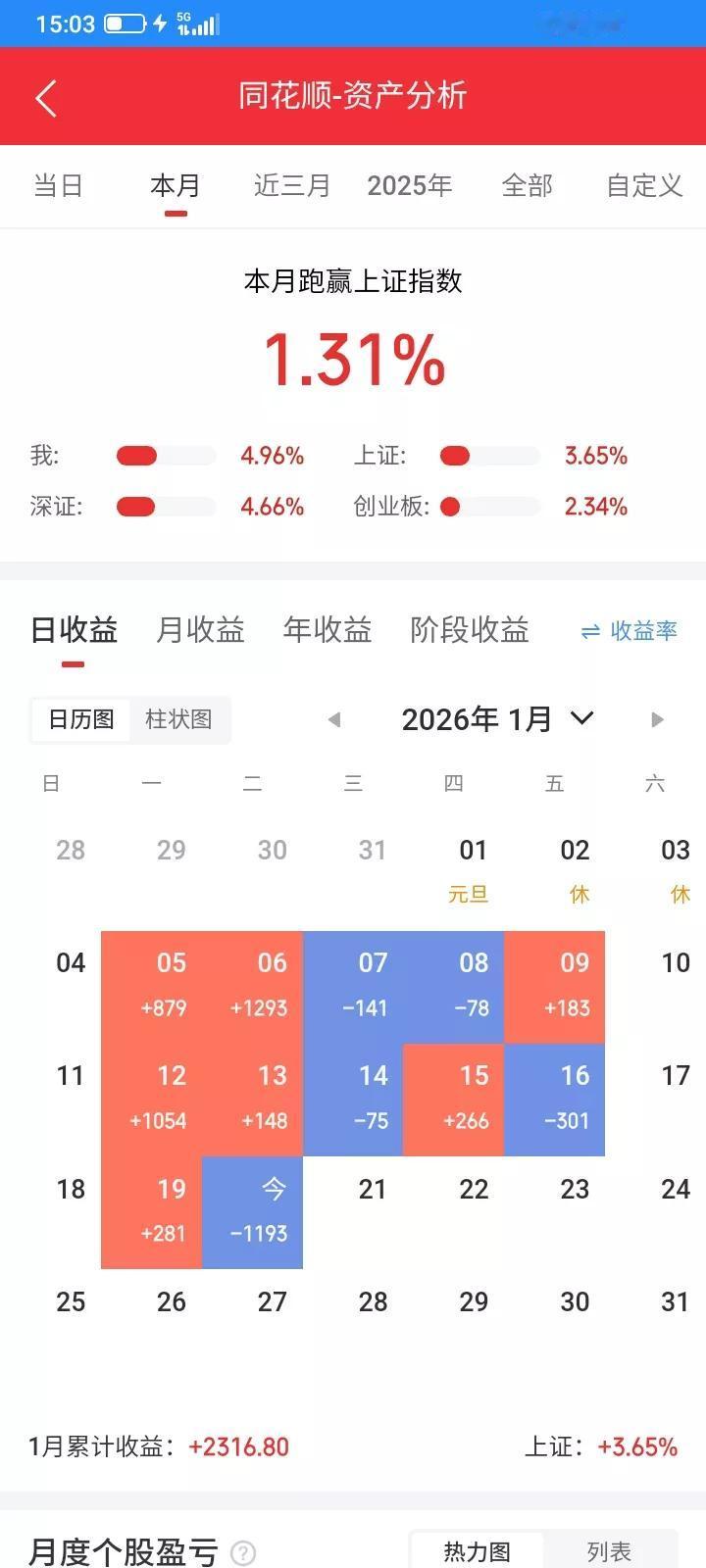 2026.01.20,今天股市上证指数下跌又顽强的拉起来了,但是我昨天收盘买入的都是买在当天最高价,昨天上涨没有赶上,今天全部大跌赶上了,又是悲惨的一天,也是考验我的交易系统的时候,亏了也要严格执行,赢得起亏得起。 今天早上预估互联网etf应该会收阳线了吧,看起来很强的样子,于是提前执行计划,以0.904提前追高买入1000股,但是买入之后就下跌了,预估错误了,买错了,收盘继续收阴线,那就继续观望,把买错了的及时止损,收盘以0.896卖掉1000股,为错误买单,多亏了8块钱。 太阳没有继续上涨,收阴线,昨天买错了,收阴线还是先卖掉吧,收盘前以10.15卖掉100股,收盘以10.15再卖掉300股,继续留下100股做底仓,为昨天的买入错误买单,多亏了110多块钱。 上能也是,今天低开低走,昨天大幅拉高就是诱多,今天大跌,最低跌到38.68,一下子亏了一千多,昨天不该太贪心,买得太多,下跌中没有管住手,以38.94卖出100股,但是下跌太快,没有成交,就撤单了,还好收盘拉起来一些,还是按照规则,为昨天的错误买单,收阴线卖掉,收盘以39.61卖掉300股,亏了520多块钱。 株冶按照规则,昨天就不该买,但是今天还是高开,以为歪打正着该赚一点钱,但是却是冲高回落,收盘虽然没有下跌,还是收阴线,还是卖掉算了,收盘以18.97卖掉,亏了一块钱印花税。 金森今天延续昨天的反弹,收阳线,就继续持有。 长鸿今天反弹了,收阳线,早上看起来很强的样子,预估今天会收阳线,于是以14.75追高买入100股,预估正确,收盘前以14.98又补仓100股,收盘以15元再补仓100股。 通信设备etf也没有延续昨天的反弹,而是下跌,昨天又买错了,今天收阴线,就卖出,收盘以1.305卖掉昨天买入的5000股,为昨天的错误买单,多亏了250多块钱。 买入错了就及时认错,最多亏一天,避免连续下跌造成大亏。卖错了也要卖。严格执行规则。 今天总市值1.72万元,总资产5.52万元,今天总体账户亏损1194元,一天把这个月的利润亏掉一半左右,赚钱没有赶上,亏钱也没有躲过。愿赌服输。