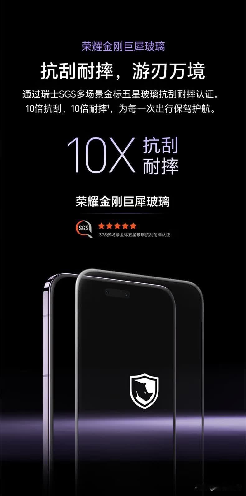 给大家看一下“荣耀巨犀玻璃”和“荣耀金刚巨犀玻璃”两个之间的区别。 荣耀巨犀玻璃,10倍抗摔。 荣耀金刚巨犀玻璃,10倍抗摔,10倍抗刮。