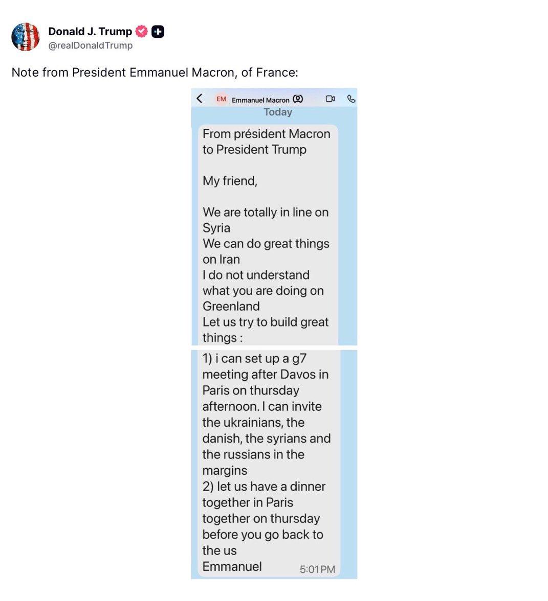 马克龙短信被特朗普曝光:我不懂你在格陵兰做什么 1月20日,美国总统特朗普在真相社交上发布了法国总统马克龙发给他的短信,马克龙在短信中写道,“我不明白你在格陵兰岛做什么”。 短信全文翻译如下: “我的朋友,我们在叙利亚问题上完全一致。我们可以在伊朗问题上做成大事。我不明白你在格陵兰岛上做什么。让我们一起做大事吧:1) 我可以在达沃斯会议之后,于周四下午在巴黎安排一场G7会议。我可以邀请乌克兰人、丹麦人、叙利亚人、俄罗斯人在场边。2) 让我们一起在巴黎共进晚餐,在你返回美国之前,周四晚上一起吃晚饭。”
