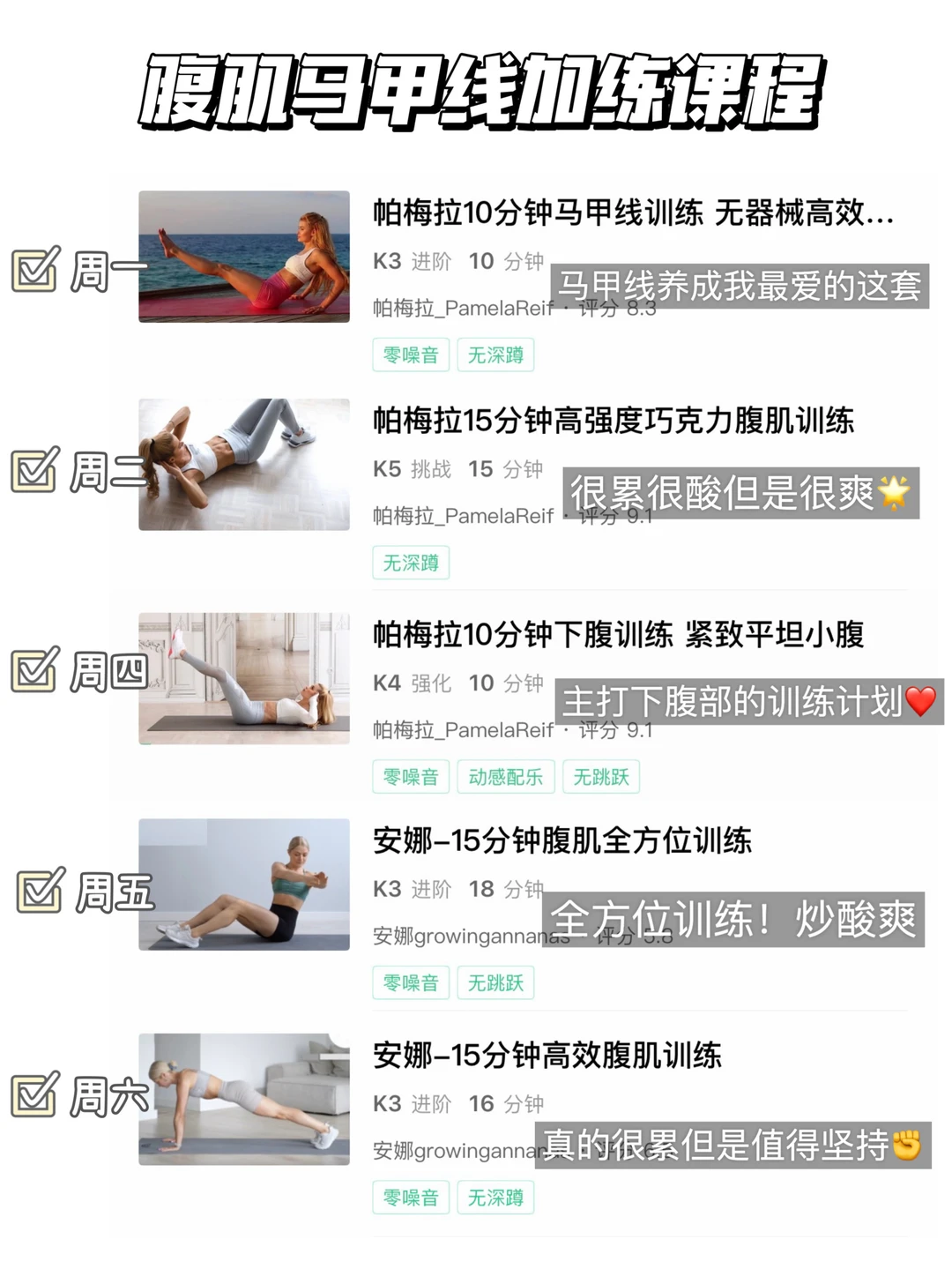身高:172cm 体重:65kg-53kg 体脂:28%-18% - 快过年了 知道姐妹们又想摆烂又不甘心摆烂 所以给大家安排了超级简单的跟练计划! 🍑小基数姐妹:就跟第二套,一天一套,一天安排了拉伸 🥭大基数姐妹:就跟第一套,一天一套,一天休息 🍓进阶姐妹:跟第二套+腹肌那一套一天1-2个 - 吃的方面尽量做到不聚餐时候吃干净的饭菜就行啦 我们一起加油 用最好的状态迎接新的生活