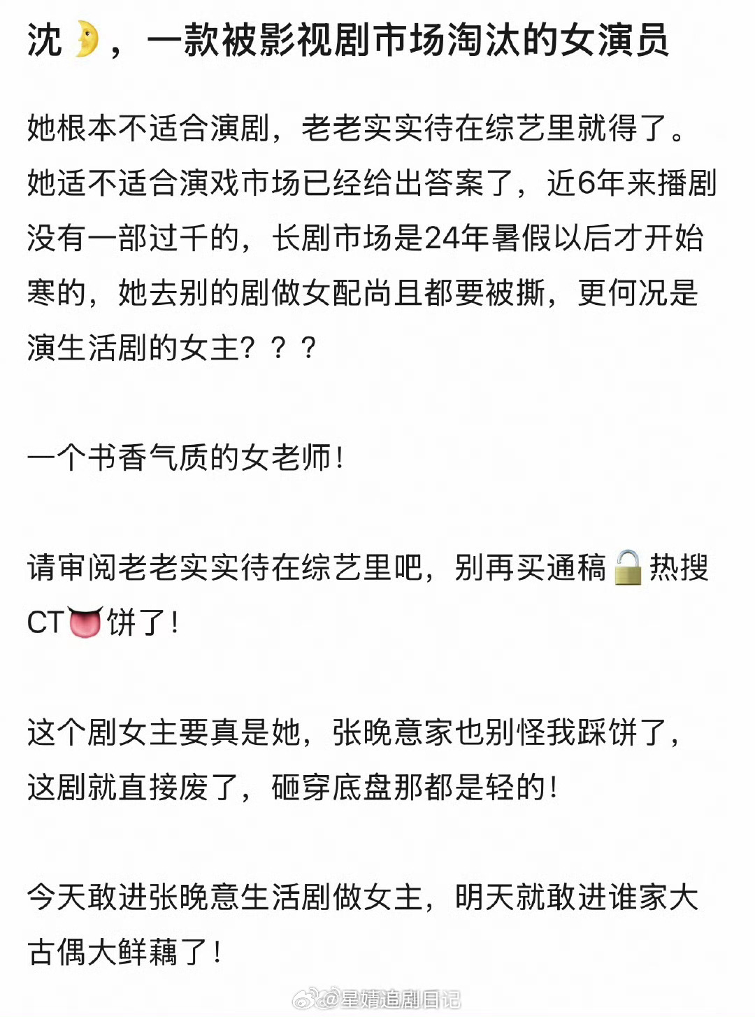 张晚意粉丝拒绝沈月的博文已经万转了… 有人总结了沈月播剧实绩和表现,得出了她是一款已经被影视剧市场淘汰的女演员。大家觉得有道理吗?