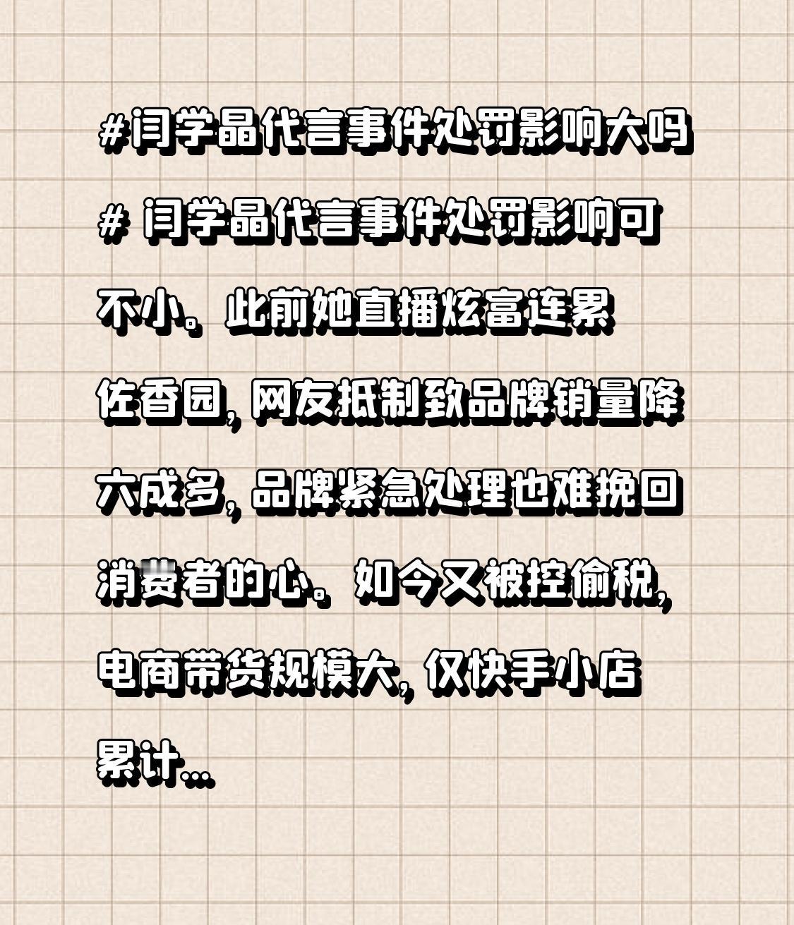 闫学晶代言事件处罚影响可不小。此前她直播炫富连累佐香园,网友抵制致品牌销量降六成多,品牌紧急处理也难挽回消费者的心。如今又被控偷税,电商带货规模大,仅快手小店累计订单达 1300 万单,估算净佣金超 7600 万,利润或过亿。若税务问题坐实,不仅她个人形象崩塌,代言品牌也会受重创,后续处罚带来的连锁反应不容小觑。