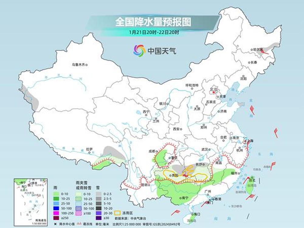 明天夜间到后天,湖南中南部、江西中部、贵州中北部、云南东北部、广西东北部等地部分地区有小雪或雨夹雪。贵州中南部、湖南西南部等地部分地区有冻雨。