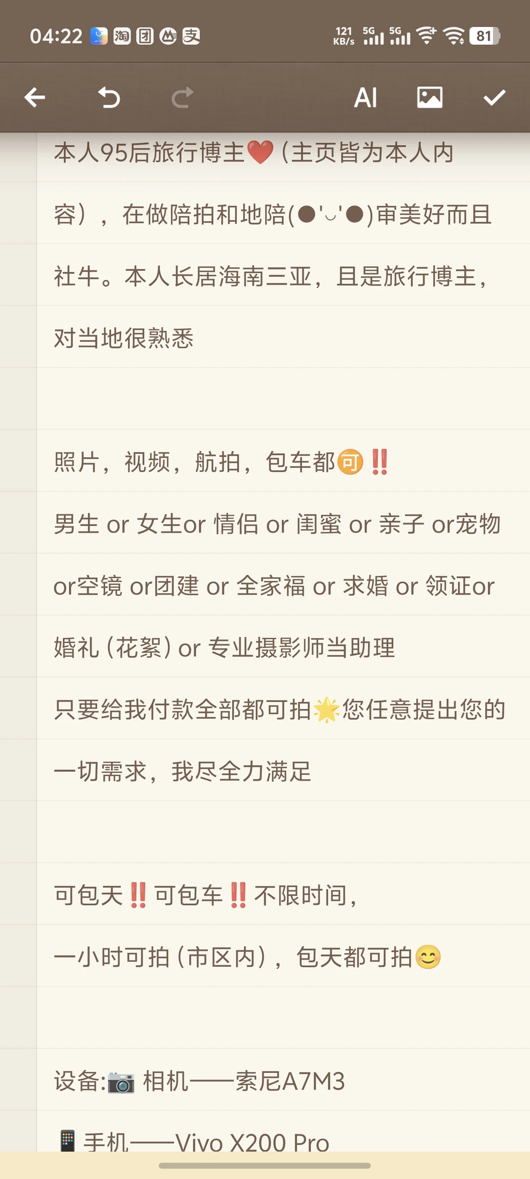 本人95后旅行博主❤️(主页皆为本人内容) ,在做陪拍和地陪(●'◡'●)审美好而且社牛。本人长居海南三亚,且是旅行博主,对当地很熟悉