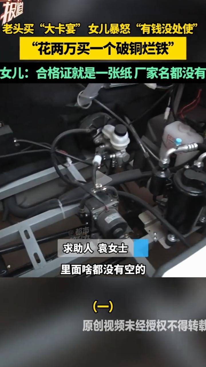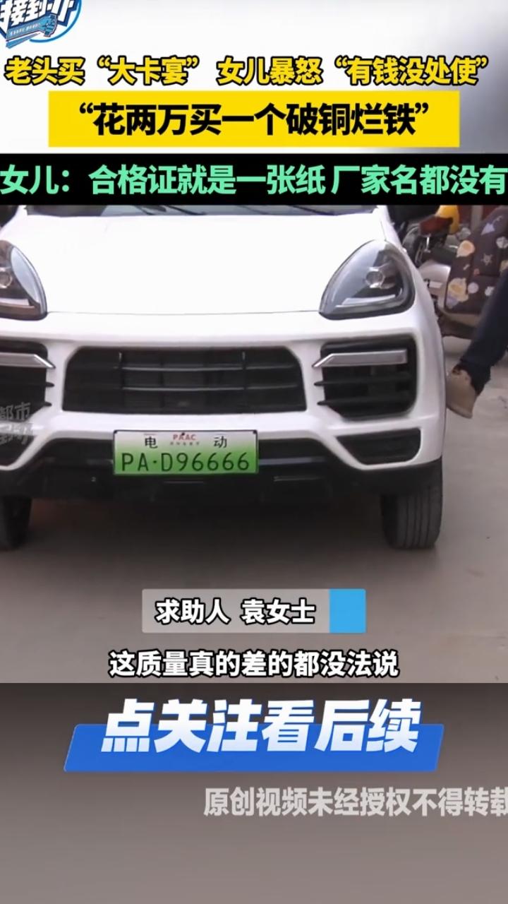 “真是气疯了!”河南,一位大叔瞒着家人花23500元网购了一辆“高配大卡宴”,女儿袁女士得知后,当场暴怒了,没想到车子到手后,一家人更是傻了眼,这不仅是辆山寨车,还根本没法合法上路! 河南的李大叔最近被一辆代步车搞得心力交瘁,这辆2025年初在网上全款买下的“高配大卡宴”,本想用来日常出行,可到手后才发现问题百出,跑遍了二手车行和相关部门,要么直言拒收,要么无法解决,最后只能求助媒体维权。 这辆“大卡宴”对李大叔来说是满心期待的“晚年好物”,他当初刷到商家宣传时,就被“高配车型”“外观大气”的介绍吸引,想着花两万多就能拥有媲美豪车的代步车,既划算又有面儿,满心欢喜地盼着它能让出行更便捷。 因为花了不少积蓄,李大叔收到车后格外爱惜,基本没怎么开,只在自家院子里试了几圈,车身没有任何磕碰,配套的合格证、说明书也都妥善收好,可即便如此,车子的质量问题还是藏不住。 当年决定买这辆车,除了被外观吸引,还因商家的一番话术。 对方在宣传中拍着胸脯保证,车辆“配置高端”“可正常上路”,完全能满足日常出行需求,就算是老年人开也无需额外手续。 李大叔被这番话打动,即便当时这笔钱对他来说不是小数目,也没跟儿女商量,就咬牙全款拿下了。 车子送到家后,李大叔越看越不对劲,心里悄悄盘算着,就算配置不如宣传,至少能正常上路也行,可现实却给了他沉重一击。 可当他仔细查看车辆和合格证,当场就愣住了,根本无法接受。 车标压根不是保时捷的盾形标志,而是印着一只鹿,被网友调侃“保时捷变保时鹿”,车身做工粗糙,车门关不严还翘边,雨刷器都放不下去 。 更关键的是,合格证上明确标注“非公路用车”,甚至连厂家名都没有,就是一张空白纸片。 李大叔的妻子杨阿姨气得直拍车盖:“买的时候说能上路,现在合格证写着非公路用车,万一开出去出事故,咱得负全责!” 女儿袁女士更是又气又无奈,对着父亲吐槽:“爸你怎么这么糊涂!花2万多买个这破铜烂铁,有钱没处使啊!” 她当场检查还发现,车子的方向盘是歪的,根本不会回正,刹车松散,行驶中还会突然断电,完全没有安全保障,直呼“质量真差,谁敢开啊。” 不甘心的李大叔试着联系卖家,可对方的电话根本打不通,他又接连跑了几家当地的二手车行,结果如出一辙,要么直接摆手拒收,称这类无合法路权、质量堪忧的山寨车没人会买,要么建议他联系厂家退款,没有一家能给出解决方案。 线下屡屡碰壁后,李大叔把希望寄托在生产厂家身上,觉得好歹是正规生产的车子,厂家总该给个合理说法。 可通过企查查联系上厂家后,工作人员的回复让他心凉半截,明确表示车子属于老年代步车,能否上路要看当地政策,他们并没有违规宣传 。 工作人员还说,车辆已经售出八九个月,现在要求退车“做人不能太过分”,若要退车,必须扣除相应的折旧费和运费 。 这让李大叔两口更加无法接受,明明是商家虚假宣传,怎么反倒成了自己的不是,只能失望挂断电话。 无奈之下,李大叔和女儿只能向媒体求助,把购车凭证、聊天记录、车辆问题照片和视频一一整理好,希望通过曝光推动问题解决。 一开始他们只盼着能全额退款,哪怕多等几天也愿意,可厂家态度强硬,协商多次都没有实质性进展。 他们一次次补充提交证据,甚至找律师咨询,律师表示,卖家涉嫌销售欺诈,李大叔可向销售者或厂家要求退一赔三 ,即便如此,厂家依旧不愿松口,还让售后敷衍回应,称“不认识厂家,只负责技术售后”,把责任推得一干二净 。 父女俩觉得又心累又无助,跑前跑后折腾了许久,都快没了耐心。 其实厂家的说法站不住脚,业内早有明确规定,未列入《机动车生产企业及产品公告》的低速电动车,不具备合法路权,根本无法正常上牌上路,而“非公路用车”的标注,本身就意味着不能在公共道路行驶,与当地政策无关 。 当年商家口中“可正常上路”的说法,不过是吸引老年消费者的营销话术。 李大叔本以为花巨款买的代步车能让晚年出行更方便,没成想却成了没法使用的“摆设”,还让一家人闹了矛盾。 他摸着几乎全新的车身,想起当年23500元的积蓄和如今车子的种种问题,满是后悔,若早知道如此,绝不会轻信网上的虚假宣传,更不会瞒着家人贸然下单。 经历了线上线下的轮番碰壁和媒体的介入报道,厂家最终同意协商解决,双方达成一致,厂家将23500元购车款全额退还给了李大叔 。 这场耗时许久的购车纠纷,总算画上了句号。 这场从23500元到“问题山寨车”的巨大落差,也给不少人提了醒,尤其是老年人网购时,切勿被“低价豪车”“高配代步”的夸张宣传误导。 购买车辆等涉及安全和资质的产品时,一定要确认产品的合法资质、路权证明和生产厂家信息,必要时与家人商量,避免因一时贪念造成不必要的损失。 那么到最后,你们怎么看呢? 信息来源:都市报道