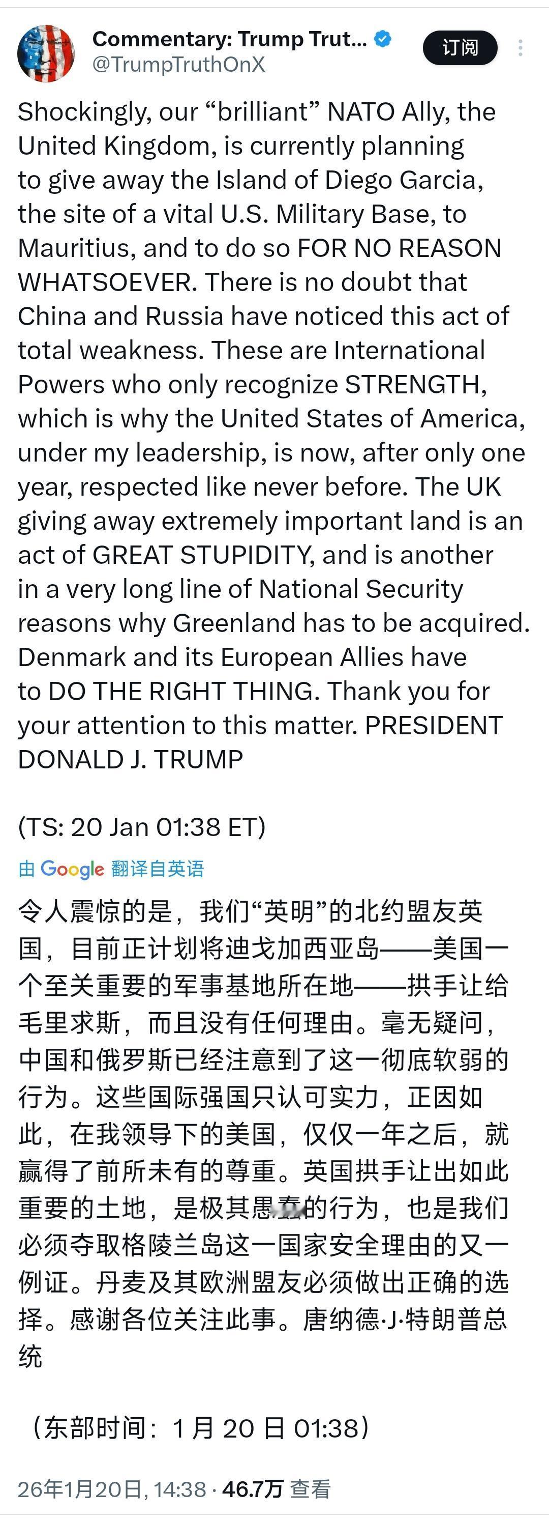 特朗普抨击英国这招,太过分了!1月20日,特朗普发文:“令人震惊的是,我们‘英明’的北约盟友英国,目前正计划将迪戈加西亚岛美国一个至关重要的军事基地所在地拱手让给毛里求斯,而且没有任何理由。毫无疑问,中国和俄罗斯已经注意到了这一彻底软弱的行为。这些国际强国只认可实力,正因如此,在我领导下的美国,仅仅一年之后,就赢得了前所未有的尊重。英国拱手让出如此重要的土地,是极其愚蠢的行为。” 说白了,特朗普这番言论,不是在正常外交交流,这是在肆意干涉他国事务! 说实话,这可能是为了凸显美国在国际事务中的主导地位,展示自己强硬的外交姿态,但他为了美国所谓的面子和利益,将国际关系的基本准则抛之脑后,是典型的政治投机。 要清楚,他看似通过抨击能让英国屈服,可实际上就像在国际关系的火药桶上点火。在国际合作领域,这种言论会破坏英美之间的信任,让其他盟友对美国的外交策略产生疑虑,美国自身也会在国际舆论中陷入被动。 并且,这种行为会影响美国民众对英国的看法,在文化交流层面造成隔阂,就像一堵无形的墙,阻碍两国人民的友好往来。 要清楚,历史上曾有国家因过度干涉他国内政引发国际冲突,如美国在越南战争中的行为。特朗普此举如不收敛,其行为模式将带来严重危害,国际问题还需通过对话协商解决。 而未来有两条路:一是特朗普持续强硬抨击,导致英美关系降至冰点,在国际事务中的合作受阻;二是双方冷静沟通,缓和矛盾,但之前的言论已如泼出去的水,难以完全消除影响。 说到底,特朗普这种抨击是一场危险的赌局,把国际关系的稳定置于险地。唯一的正道是尊重他国主权、平等对话合作。 以上是小编个人看法,如果您也认同,麻烦点赞支持!有更好的见解也欢迎在评论区留言,方便大家一同探讨。
