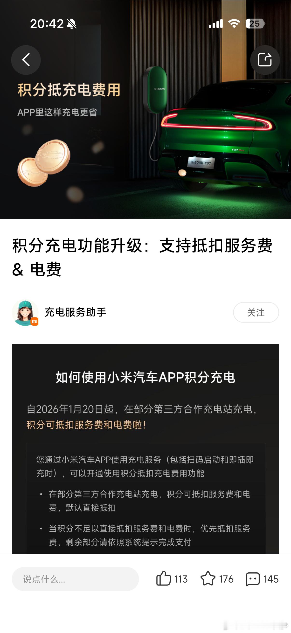 朋友们!你米支持用积分充电啦注意,是支持抵扣电费&服务费!(如果没记错以前是只可以抵扣电费,服务费要自己出)看了一下支持的充电桩,基本上像南方电网这种比较大型的都ok,大家可以上充电地图看自己家附近有哪些还有就是开通积分抵扣的指南我放在图3了,大家自取小米yu7小米汽车