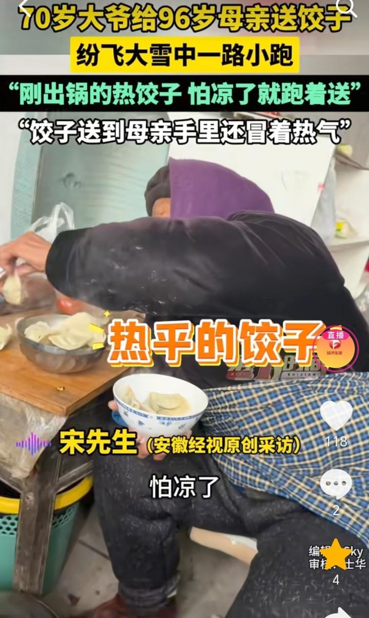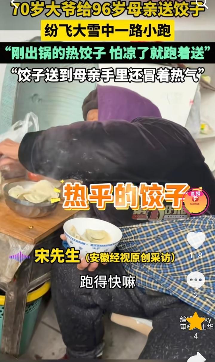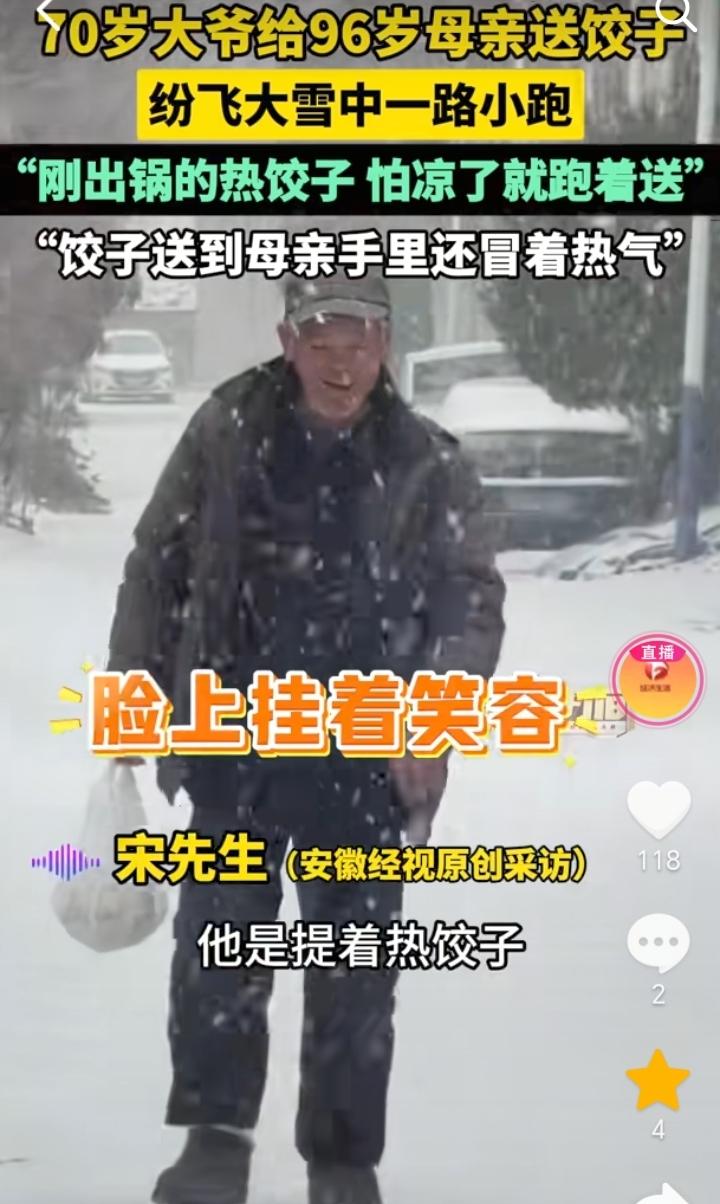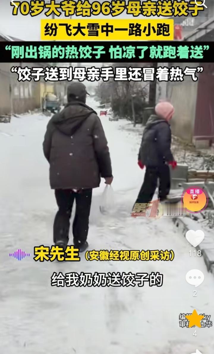 尽孝需趁早!山东临沂,天空大雪飞纷,男子大约在四五百米的时候看到有一个老人,他一路小跑,男子感觉像是自己的二大爷,等到大约距离100米的时候,男子发现老人就是自己70岁的二大爷,他脸上还挂着笑容,手上提着热饺子是来给96岁的母亲送饺子来了,担心时间长饺子凉了,所以他就一路小跑过来。 大雪飞纷还能惦记着给母亲送饺子,担心走时间长了饺子凉了,一路小跑过来,足以看出老人对母亲的孝顺,自己吃饺子也不忘了母亲,虽然说大爷已经70岁了,但是在96岁的母亲面前,他也还是一个“孩子”。 不过这位老人和他的母亲身体也不错,这么大的年龄还能有一个好身体,也算是有福之人。 小时候当母亲的操心孩子吃喝,等到母亲老了,也就到了孩子孝顺父母的时候了。 孝顺不能只是嘴上说,是要付出行动的,所以尽孝还是要趁早,不要等到人不在了才想起来,那时候就晚了。