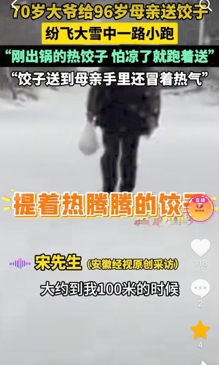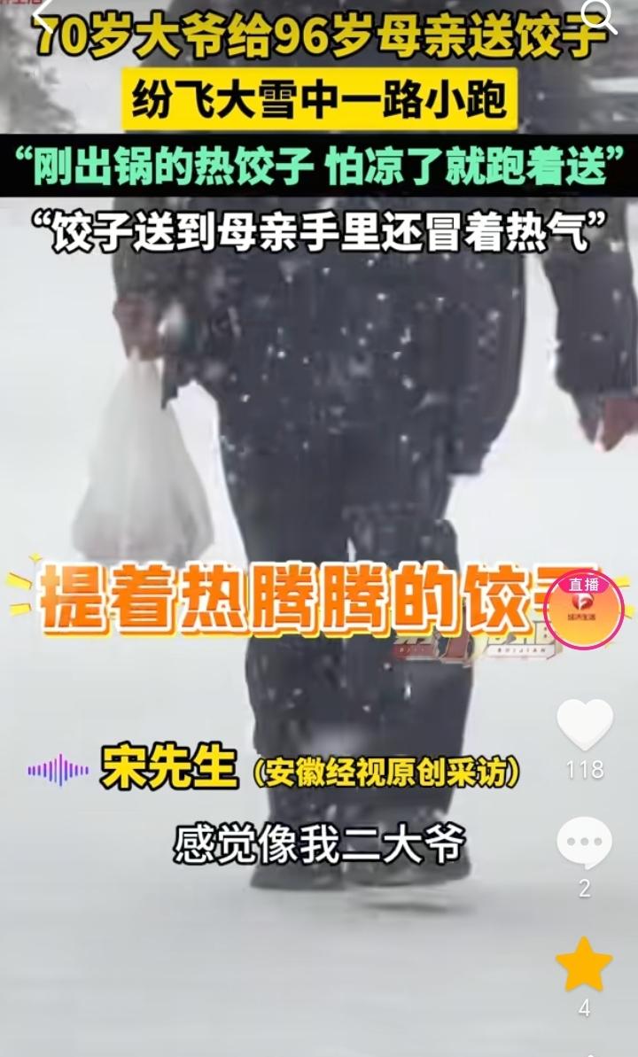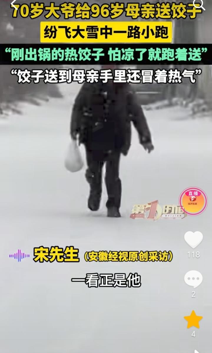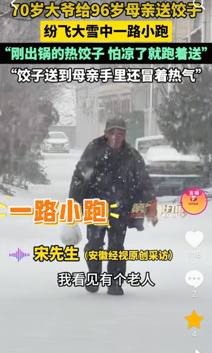 尽孝需趁早!山东临沂,天空大雪飞纷,男子大约在四五百米的时候看到有一个老人,他一路小跑,男子感觉像是自己的二大爷,等到大约距离100米的时候,男子发现老人就是自己70岁的二大爷,他脸上还挂着笑容,手上提着热饺子是来给96岁的母亲送饺子来了,担心时间长饺子凉了,所以他就一路小跑过来。 大雪飞纷还能惦记着给母亲送饺子,担心走时间长了饺子凉了,一路小跑过来,足以看出老人对母亲的孝顺,自己吃饺子也不忘了母亲,虽然说大爷已经70岁了,但是在96岁的母亲面前,他也还是一个“孩子”。 不过这位老人和他的母亲身体也不错,这么大的年龄还能有一个好身体,也算是有福之人。 小时候当母亲的操心孩子吃喝,等到母亲老了,也就到了孩子孝顺父母的时候了。 孝顺不能只是嘴上说,是要付出行动的,所以尽孝还是要趁早,不要等到人不在了才想起来,那时候就晚了。
