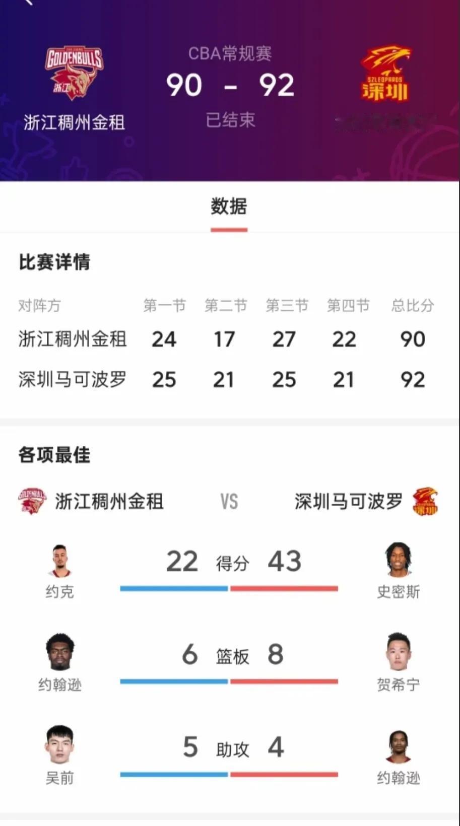 深圳队小男孩厉害啊,带领球队客场92-90击败浙江,比赛最后有如浙江绝杀广东,剩下5秒情况下艰难投进3分,厉害啊,有小男孩名号称呼的就是厉害,想起当年的原子弹。 史密斯还是联盟最年轻外援,本场比赛又是得40多分,深圳队太会选外援了。 郑永刚自从率领青年队全运会夺冠,感觉执教水平也提升不少,今年深圳前六强很有把握。 浙江队有约克,深圳有小男孩史密斯,下赛季朱芳雨好好把他挖过来,这样广东队就无敌了。
