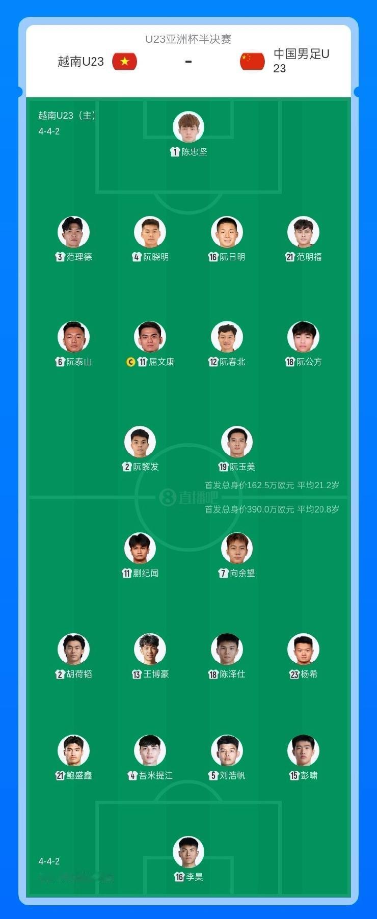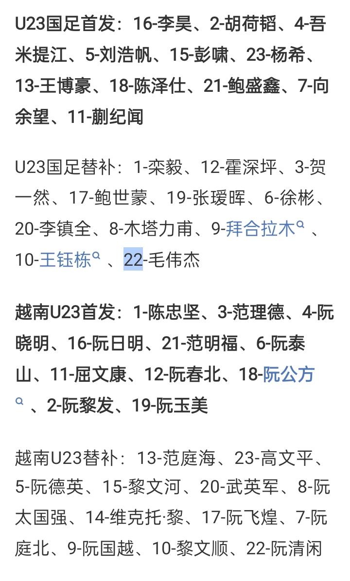 U23国足vs越南首发出炉:李昊先发、蒯纪闻、胡荷韬、向余望、杨希先发,王钰栋、拜合拉木替补 01月20日讯北京时间23点30分,U23亚洲杯半决赛,中国男足U23vs越南U23,赛前双方首发出炉:U23国足方面大变动,李昊、蒯纪闻、向余望先发,胡荷韬、吾米提江、彭啸、杨希悉数出战,王钰栋、拜合拉木、徐彬替补