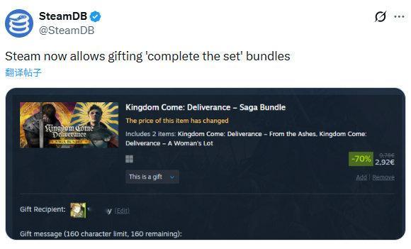 Steam现已支持赠送“补齐捆绑包”,价格将按收礼方拥有游戏进行收费。