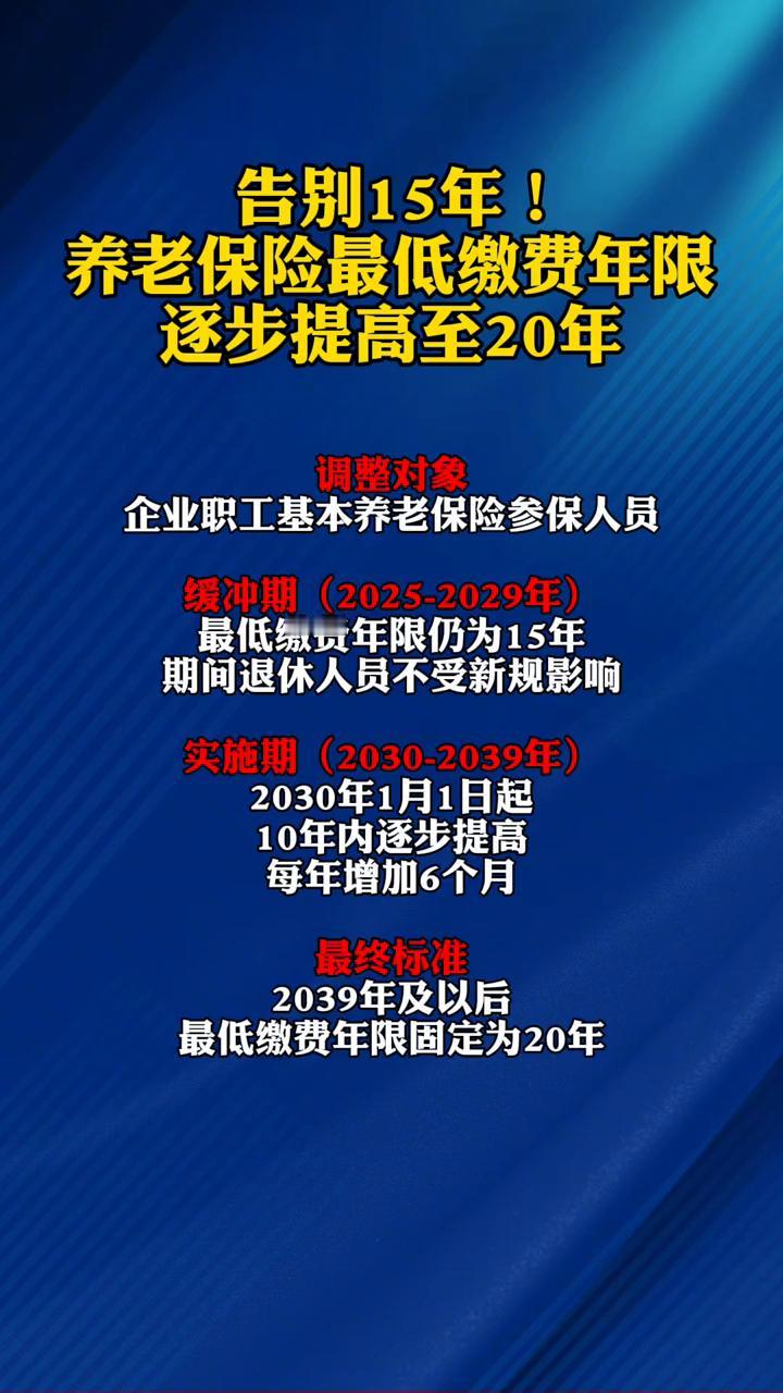 告别15年!养老保险最低缴费年限逐步提高至20年。 调整对象:企业职工基本养老保险参保人员。缓冲期(2025-2029年)最低缴费年限仍为15年,期间退休人员不受新规影响。实施期(2030-2039年),2030年1月1日起,10年内逐步提高,每年增加6个月。最终标准:2039年及以后最低缴费年限固定为20年。