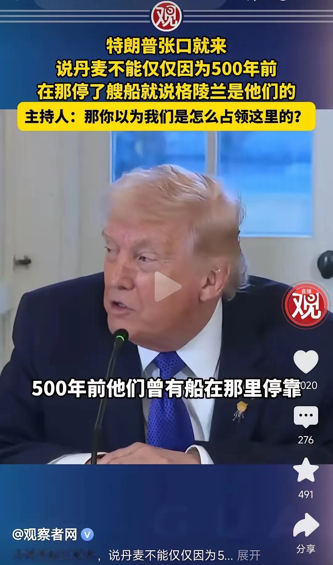 特朗普最近又整出离谱发言,对着格陵兰岛的归属权指手画脚,说丹麦就因为500年前派船去过,就想占着这岛,哪有这道理!这话一出口,不光丹麦媒体炸了,连网友都觉得这逻辑太魔幻。 要知道格陵兰岛是丹麦的自治领地,人家当地有自己的治理体系,丹麦管着外交和国防,跟“谁先到就是谁的”压根不沾边。特朗普倒好,一边说美国“必须得到”格陵兰岛,扯着“国家安全”的幌子,一边拿几百年前的旧事抬杠,连美国从法国买路易斯安那领地的老黄历都翻出来了,这算盘打得隔着大西洋都能听见。 更逗的是还有人跟着附和,说英国当年流放囚犯到澳大利亚,总不能这样就占了地。可这话完全站不住脚,现在的主权归属哪是靠“谁先到”定义的?都是有国际法和历史条约撑着的,特朗普这波操作,说白了就是想把自己的想法套在国际规则上,难怪被丹麦媒体批成“殖民心态”。 本来大家都习惯特朗普的离谱发言了,可这次扯到领土归属,实在让人忍不住想吐槽。网友说:“特朗普这是把历史课当童话听了吧?按这逻辑,那最早去美洲的印第安人,是不是该把美国收回去?与其惦记别人的岛,不如先管管自己国内的事儿,别整天整这些没谱的‘领土幻想’了!”