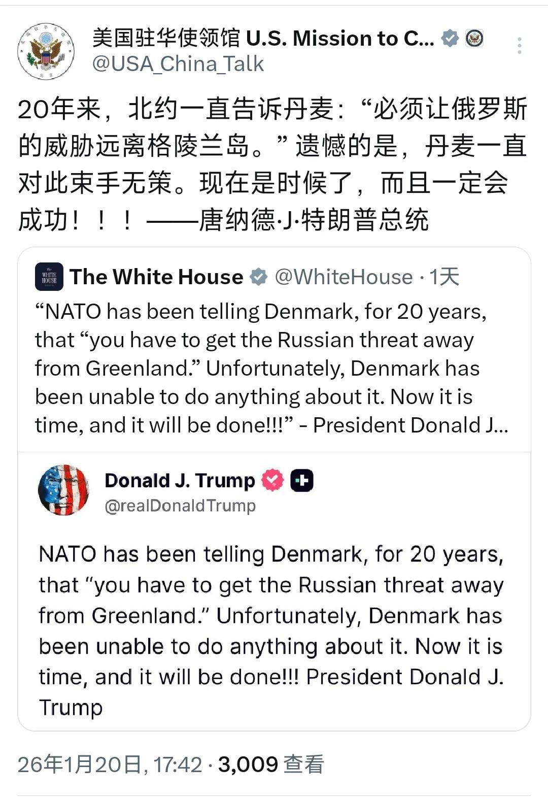美国驻华使领馆今天(1月20日)转发特朗普在社交平台上发文:‘20年来,北约一直在丹麦:‘必须让俄罗斯的威胁远离格陵兰岛。’遗憾的是,丹麦一直对此束手无策。现在是时候了,而且一定会成功!!!” 美国让丹麦二选一,特朗普说要么把格陵兰岛让美国占有,要么拱手让给中俄,因为格陵兰岛到处都是俄罗斯和中国的船只。但丹麦外交大臣拉斯穆森以及丹麦北极联合司令部司令安诺森均予以否认,并称“特朗普的说法并不属实,几十年来在格陵兰岛没有发现中国和俄罗斯的船只。显而易见,特朗普制造谣言意欲夺取格陵兰岛”。