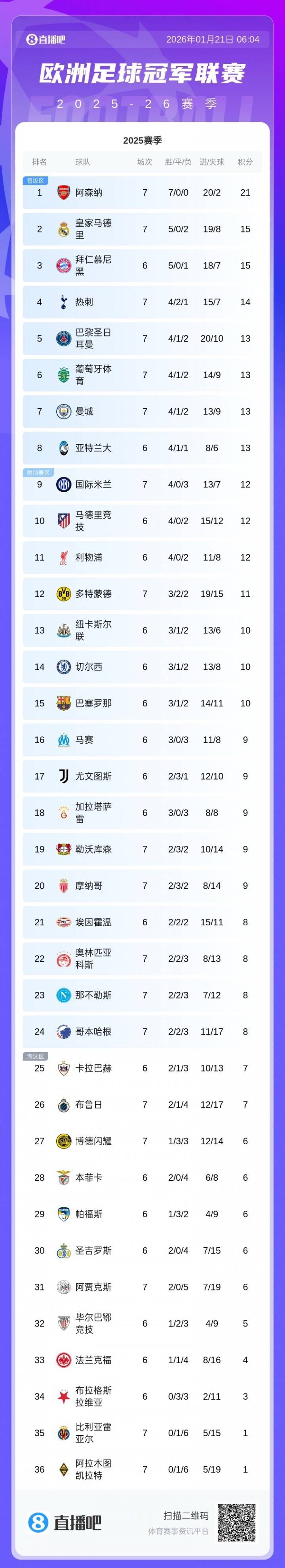 直播吧01月21日讯本轮欧冠,国米1-3不敌阿森纳,遭遇欧冠三连败,积分榜上跌至第9位,并且后续第7轮还有其他未赛队伍。