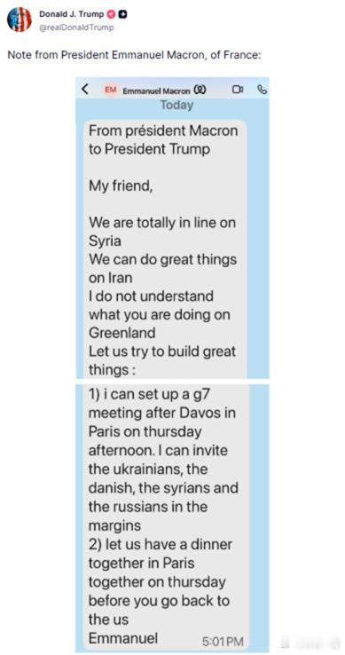 特朗普公开马克龙私信、以200%关税胁迫法国加入“和平委员会”,堪称霸权政治的荒诞闹剧。私人外交对话沦为公开施压工具,“朋友”称谓背后是赤裸裸的利益绑架,彻底撕碎了西方盟友关系的虚伪面纱。美国作为法国葡萄酒最大海外市场,此举不仅将重创法国60万相关就业岗位,更暴露其“顺我者昌逆我者亡”的霸权逻辑。马克龙的外交试探与特朗普的粗暴威胁形成鲜明对比,凸显跨大西洋关系的深层裂痕。特朗普公开马克龙给他的私信