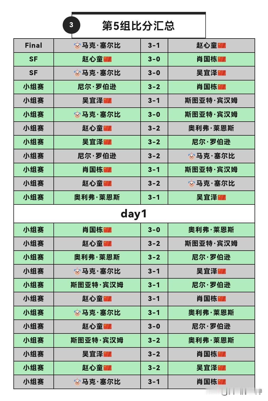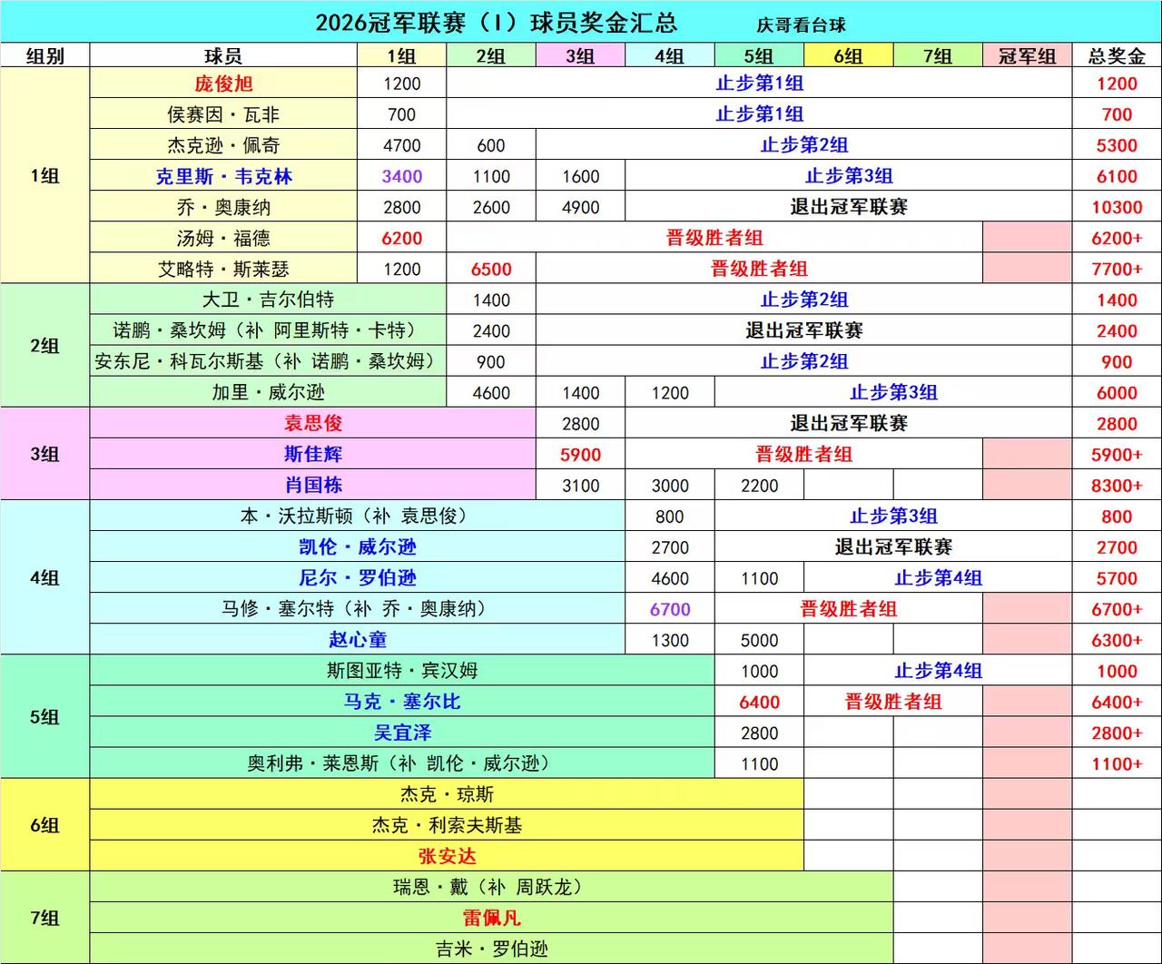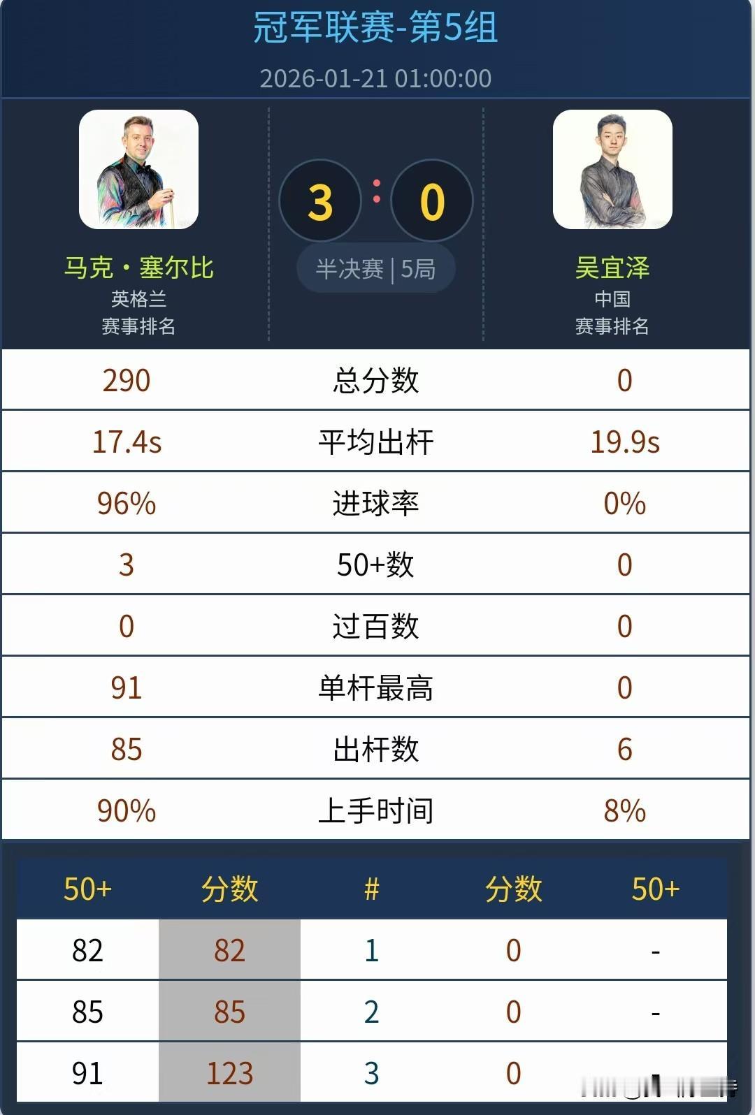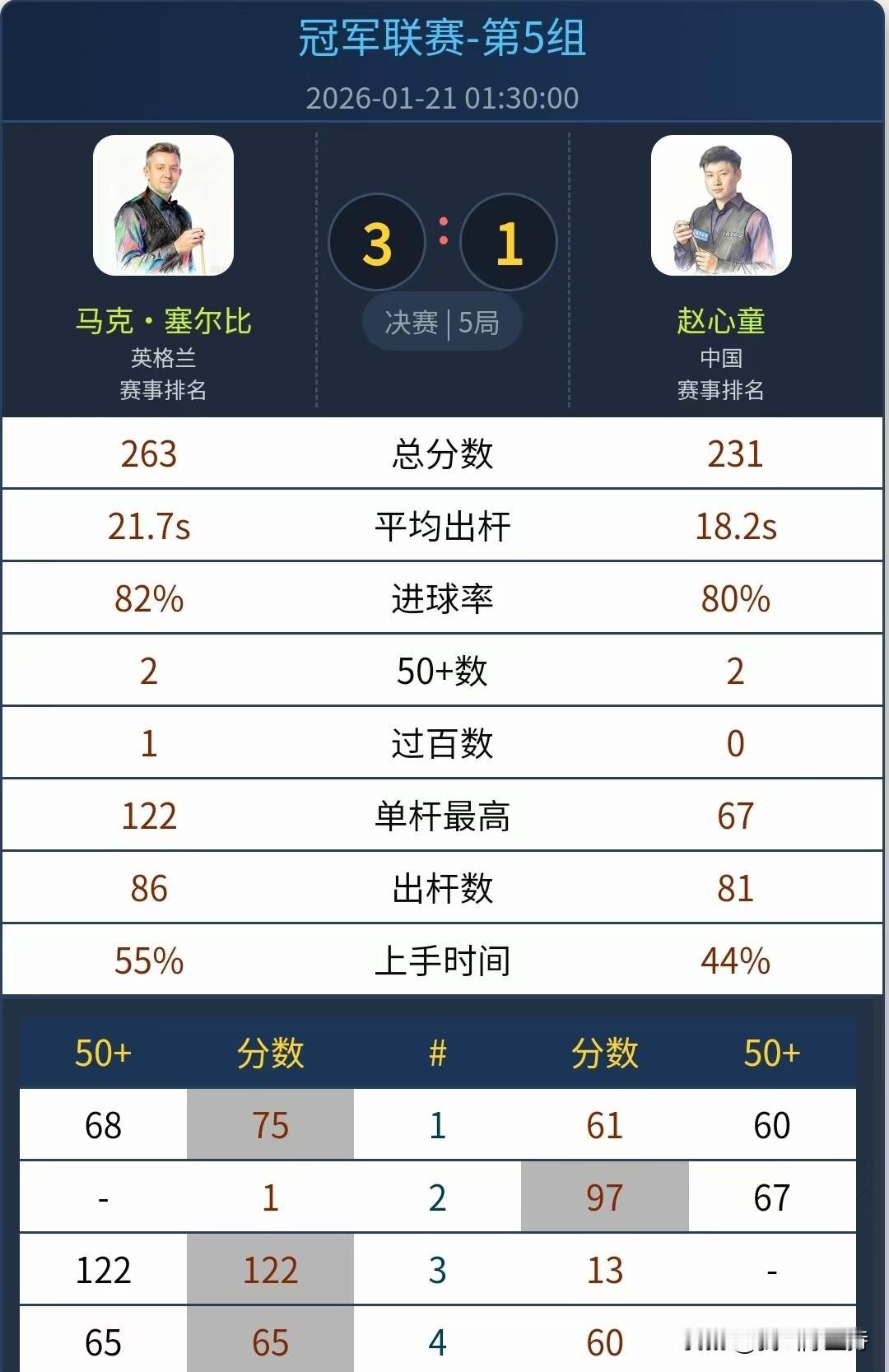 围剿失败,塞尔比脱颖而出,在第5小组成功晋级。 冠军联赛积分赛第5小组,赵心童6战全胜排第1,塞尔比小组赛分别输给赵心童和罗伯逊排第2,吴宜泽第3,肖国栋第4。罗伯逊和宾汉姆被淘汰。 半决赛吴宜泽对阵塞尔比,赵心童对阵肖国栋,形成三英战吕布的局面,塞尔比3-0战胜吴宜泽,吴宜泽一分未得。赵心童3-0战胜肖国栋,打出两杆60+。决赛,赵心童1-3不敌塞尔比。塞尔比卫冕再进一步。 赵心童、肖国栋、吴宜泽继续延续下一场。肖国栋已经拿了三组,目前奖金到了8300英镑,也还不错。 今天展开第6小组的争夺,加入了张安达、利索夫斯基、和杰克琼斯。和原有的吴宜泽、赵心童、肖国栋、莱恩斯形成新的七人组合。目前晋级冠军组的中国球员只有斯佳辉一人。 晚上7点,赵心童对阵杰克琼斯,张安达对阵利索夫斯基。