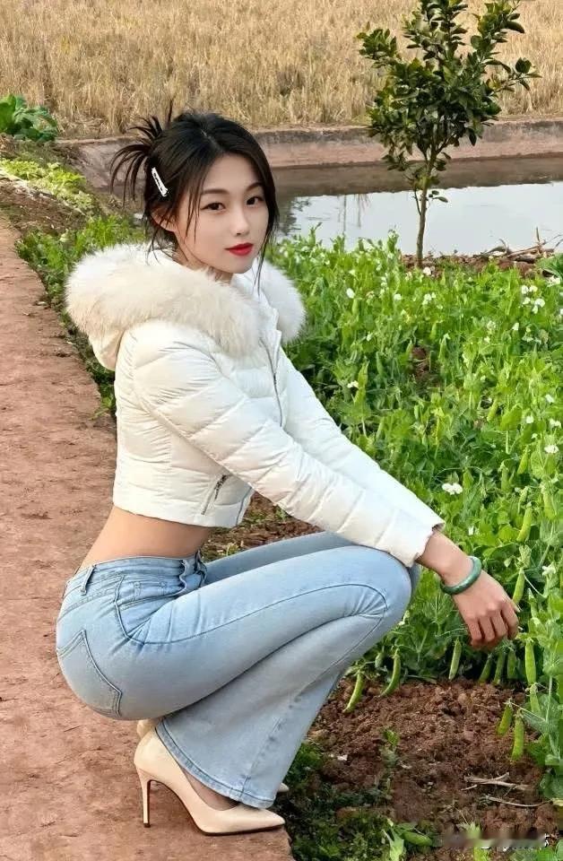 冬日暖阳下,少女蹲在田间,感受大自然的美好。