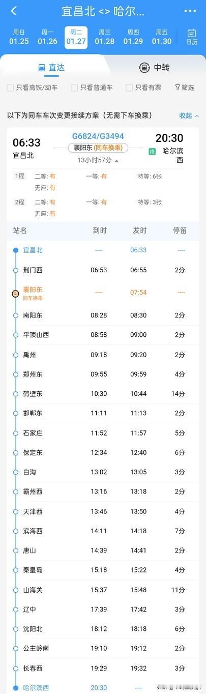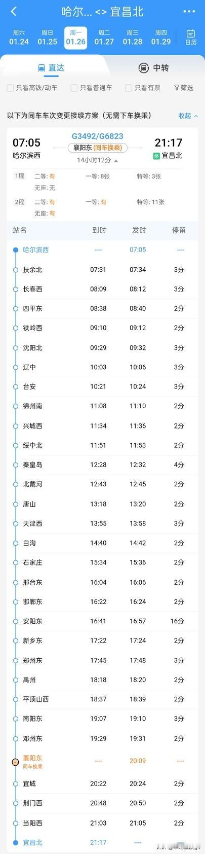 1月26日起,哈尔滨西至宜昌北直达高铁来了,同车换乘,到宜昌去看三峡 哈尔滨到宜昌,一直以来并没有直达列车,需要在襄阳或者武汉中转换乘,并不是太方便。 而2026年1月26日起,铁路调图以后,哈尔滨西至襄阳东的G3492次列车,可以同车换乘G6823次列车去往襄阳北了,不用下车,就是这一趟列车就可以直达。全程需要14小时。早上7:05出发,晚上21:17到达。 返程车也是同车直达,先是宜昌北至襄阳东使用G6824号段,然后在襄阳东至哈尔滨西区间使用G3494号段,全程也是14小时,宜昌北站6:33出发,哈尔滨西20:30到达。 通过这趟高铁,哈尔滨可以直接去宜昌看三峡了,可以来看看松花江和长江哪一个激流更快。宜昌也可以坐高铁来哈尔滨,逛逛冰雪世界。大自然的水可以千变万化。