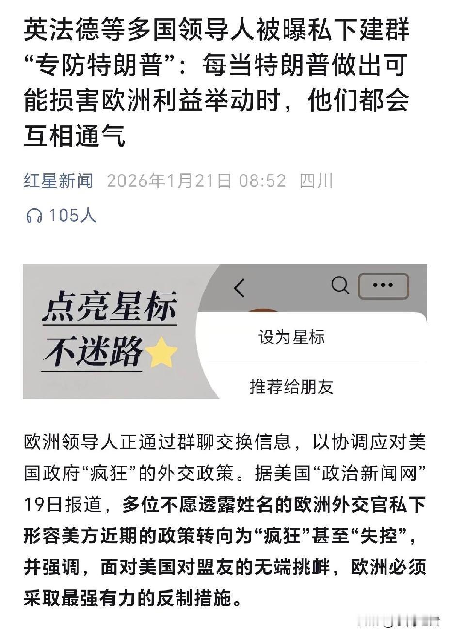 英法德这些欧洲大佬也太逗了,居然私下建群专门“防特朗普”!马克龙、默茨他们天天在群里蹲守,只要特朗普一出幺蛾子——比如拿关税威胁要“买”格陵兰岛,或者搞单边制裁,就立马互相通气抱团。这哪是盟友间的操作,分明是被特朗普的“黑手党式手段”逼得没办法,只能搞个“防坑互助群”!以前欧洲总跟着美国后面当小弟,现在总算看清了:美国根本不是靠谱盟友,而是说翻脸就翻脸的“霸权大哥”,为了抢资源连加征25%关税的狠招都敢用。这群聊看似是临时抱佛脚,实则是欧洲在偷偷抱团搞“后美国时代”的协作,连反制关税清单、反胁迫工具都准备好了。说白了,特朗普的霸道操作反倒帮欧洲拧成了一股绳,以前散沙似的各国,现在为了不被收割,终于想起要联手硬刚了,只能说这波也算是“因祸得福”啊!