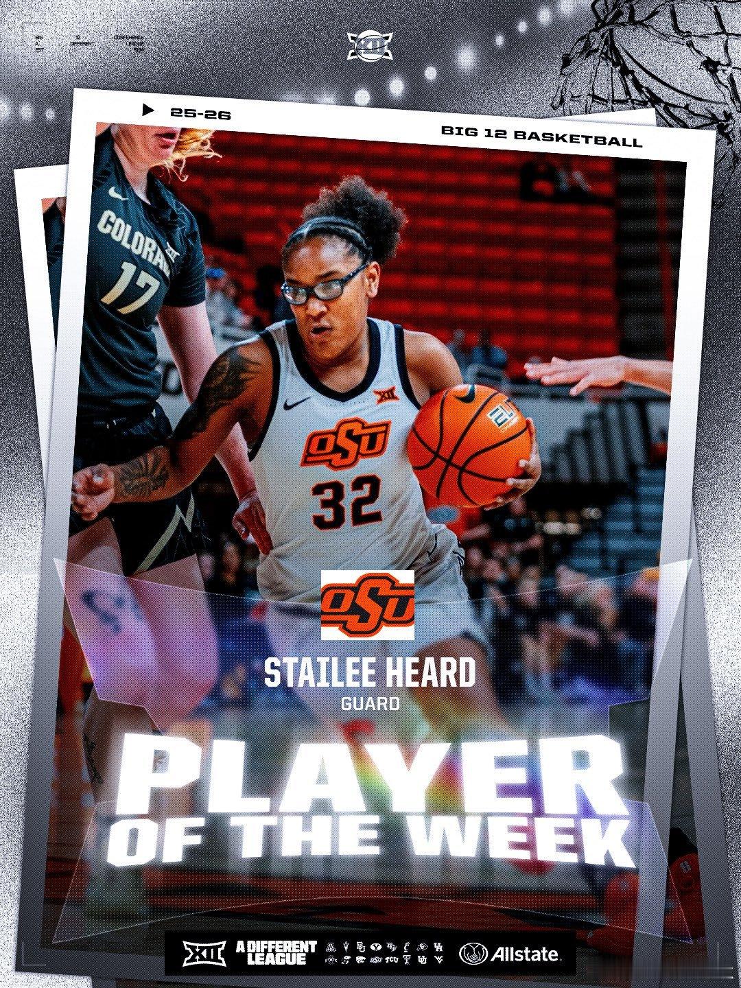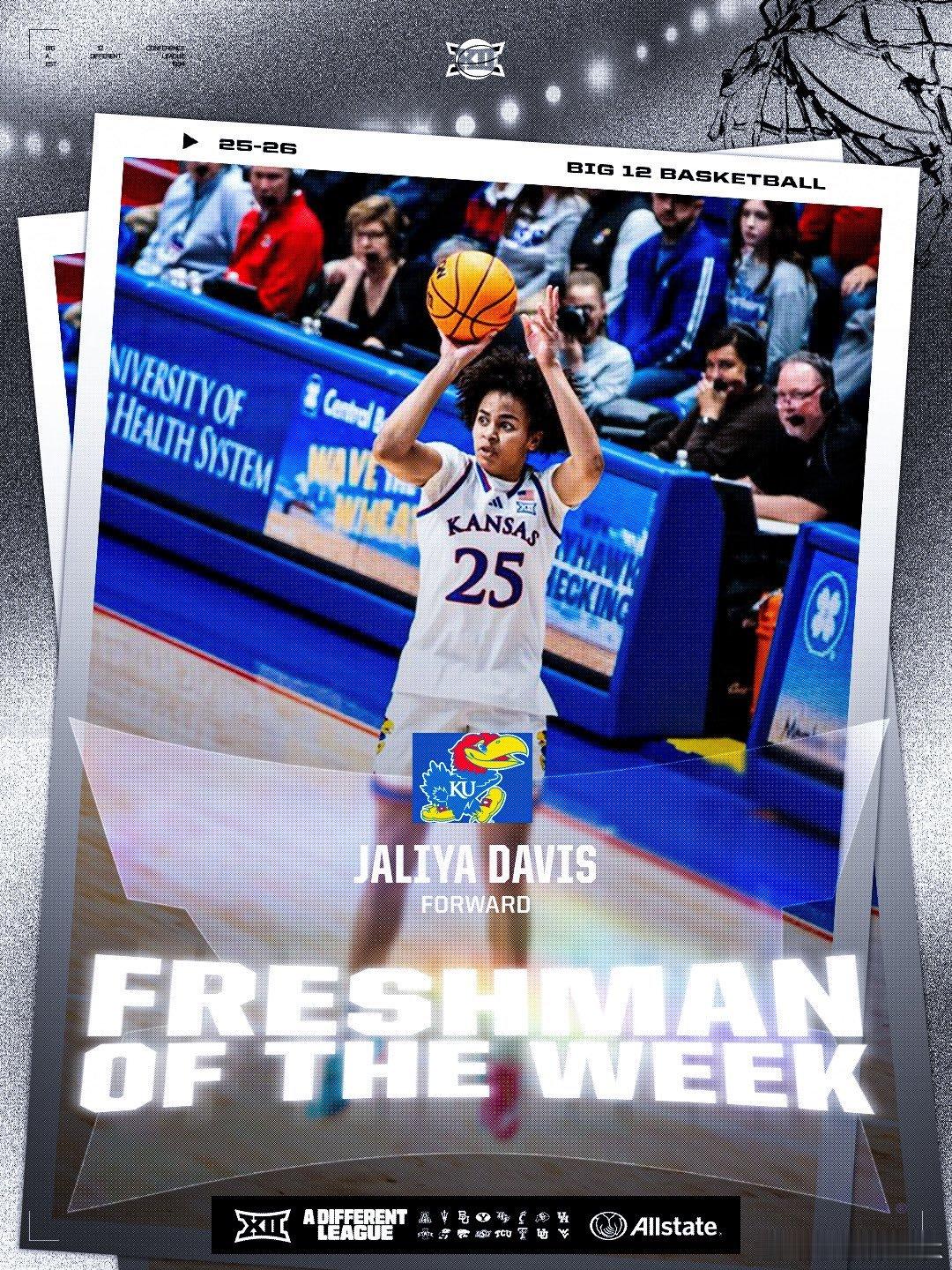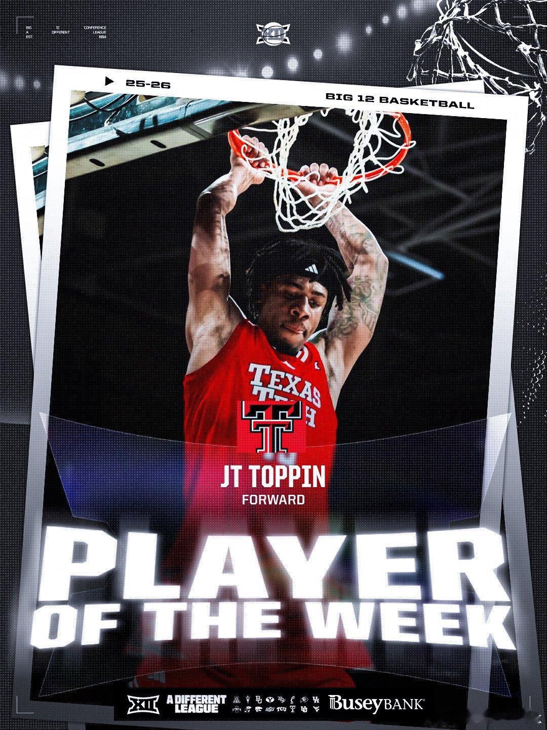 Big 12联盟第11周表现奖(2025-2026赛季)。NCAA男篮 最佳球员:JT Toppin,最佳新生:Darryn Peterson。NCAA女篮 最佳球员:Stailee Heard,最佳新生:Jaliya Davis。