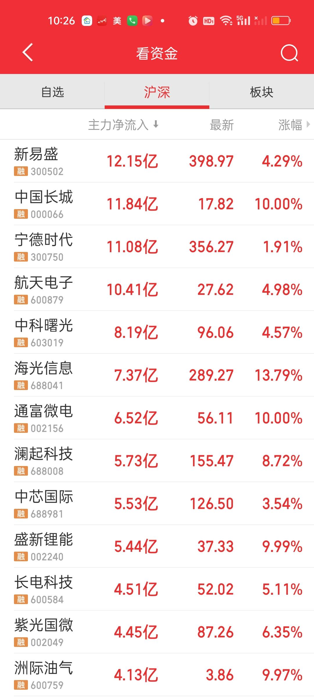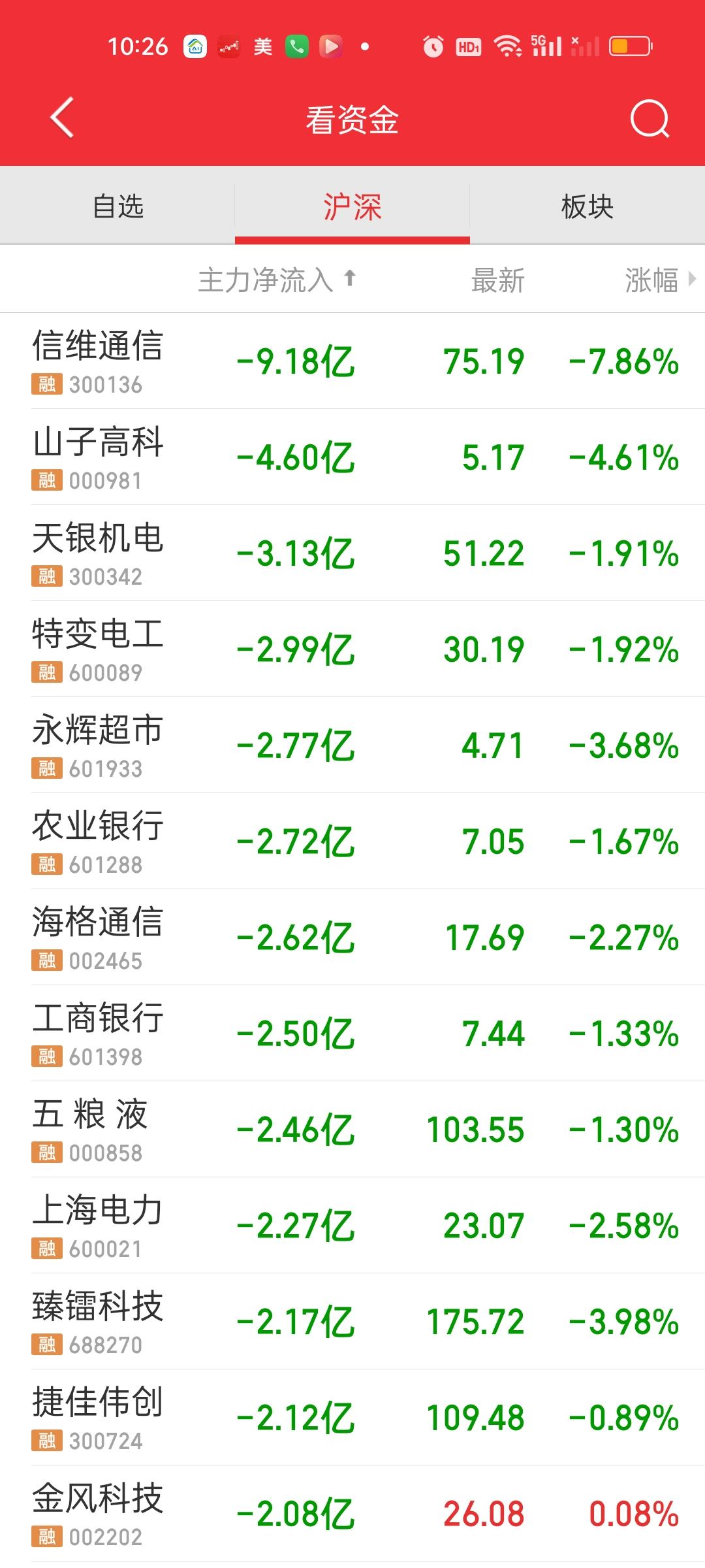 今天资金其实没怎么流出,但成交量缩量太厉害了。50分钟已经缩量2400亿了,全天可能4200亿都不够。不过如果再来一次短时间内带量的急速下杀,估计放量3000亿都有可能。上涨放不了量但急速爆杀一定可以。 主力净流入超过10亿的个股有4家,新易盛,中国长城,宁德时代,航天电子。暂时没有流出资金超过10亿的个股。