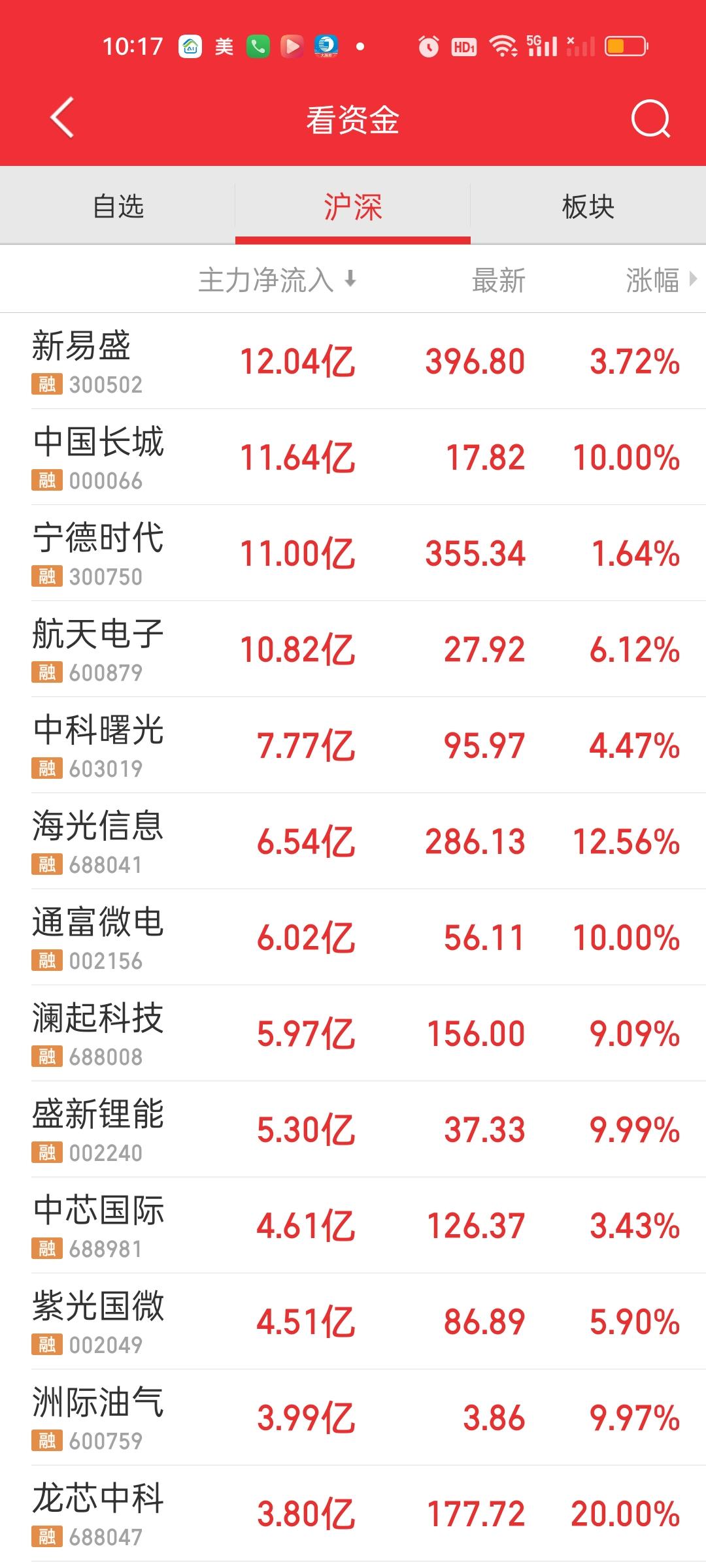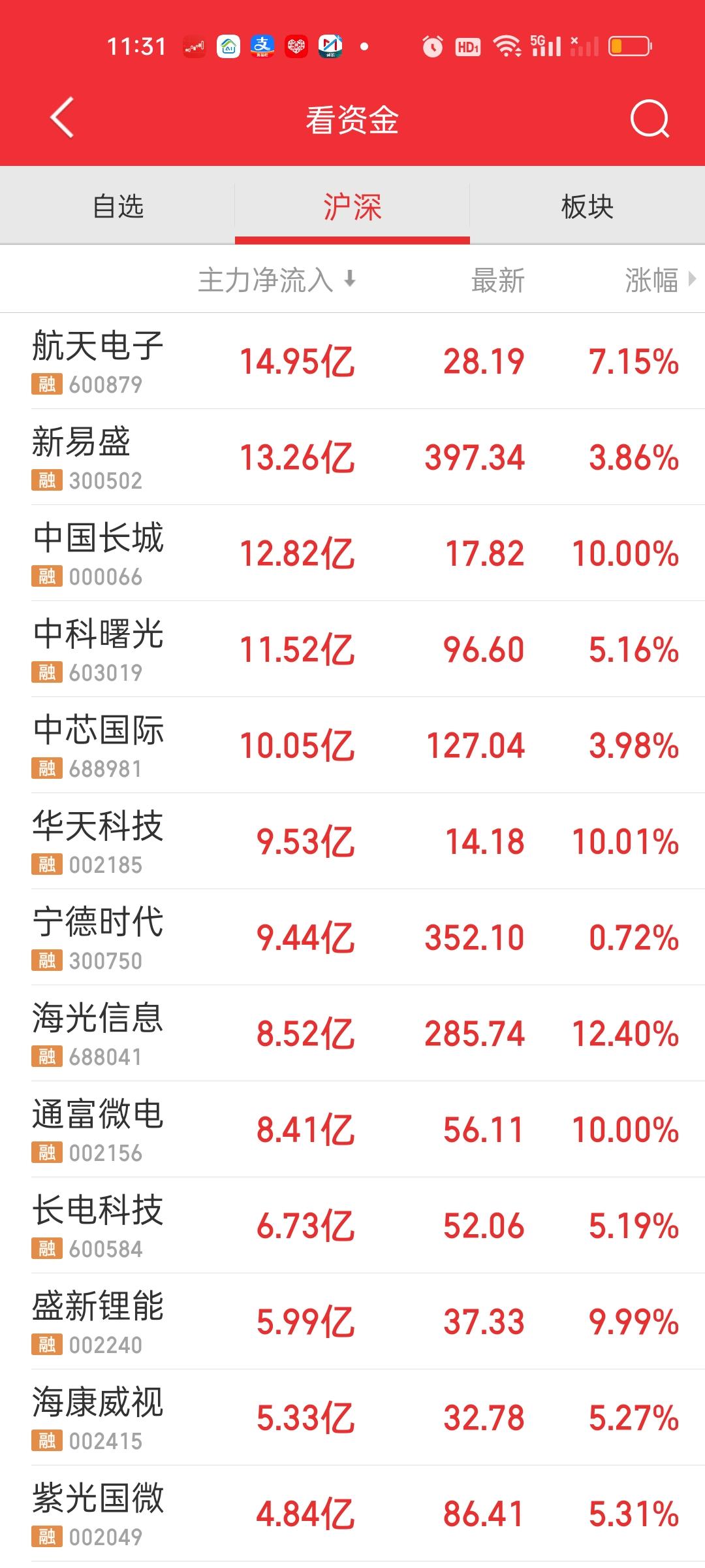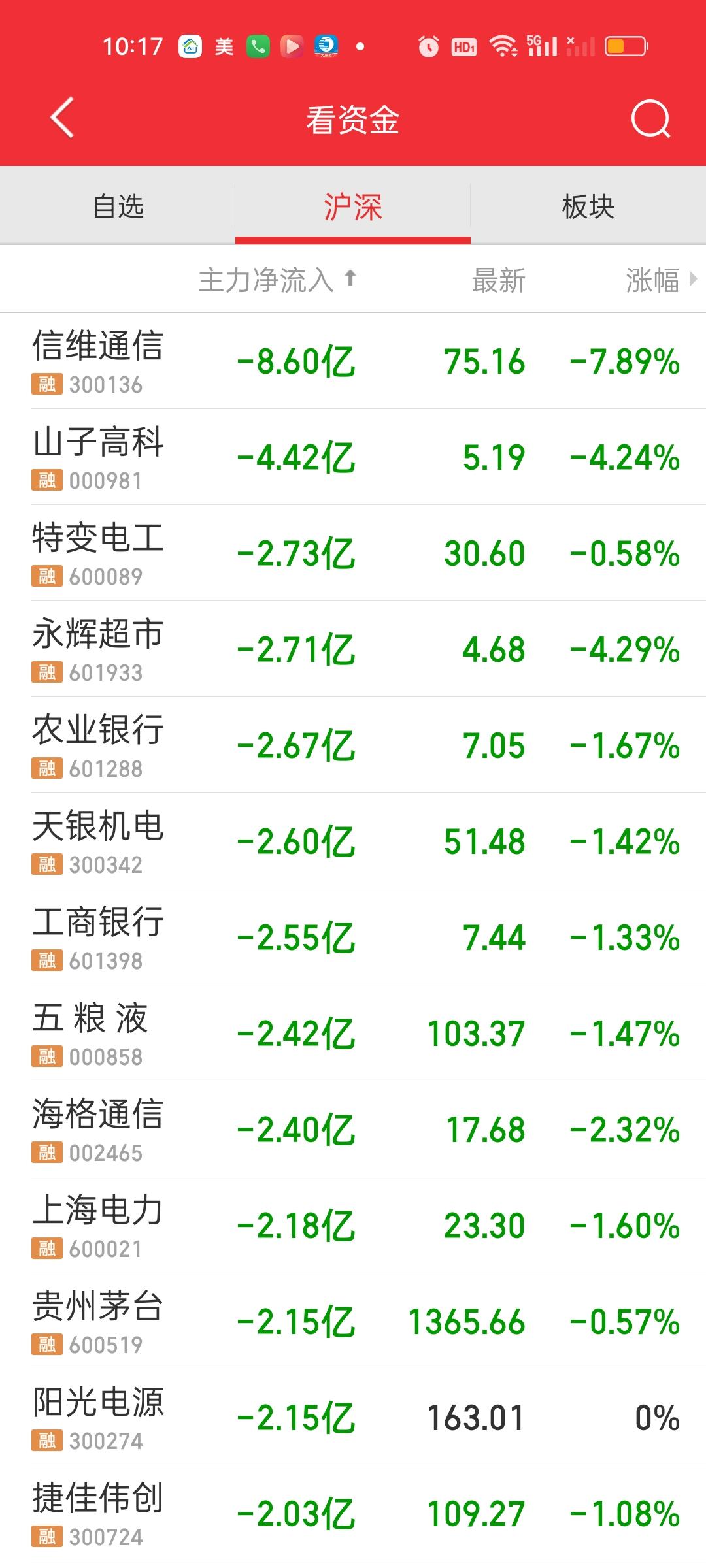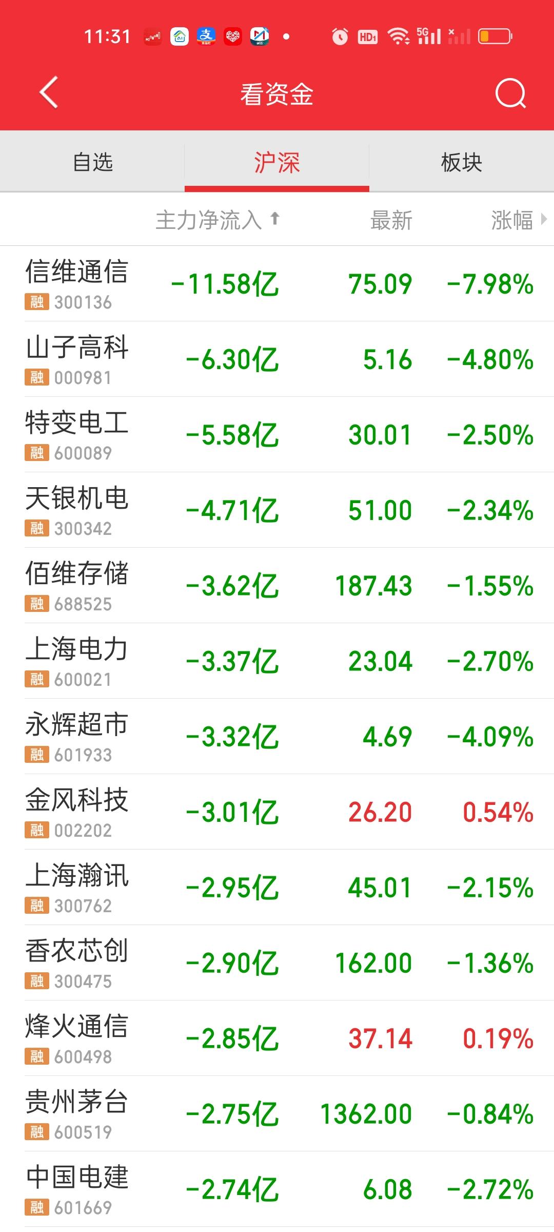 中午收盘了,尾盘15分钟还是有一个明显的下杀的。下午还会不会继续下杀说不好,我想大概率还会有。不过大盘资金还是净流入的状态,说明前面几天可能出现了超卖的状态。特别是昨天。机构应该卖了不少。今天要进点货,后面好接着砸。总之一句话,调整是肯定没有结束的! 主力资金净流入方面,中科曙光净流入超过10亿元。流出方面只有信维通信净流出资金超过10亿元。
