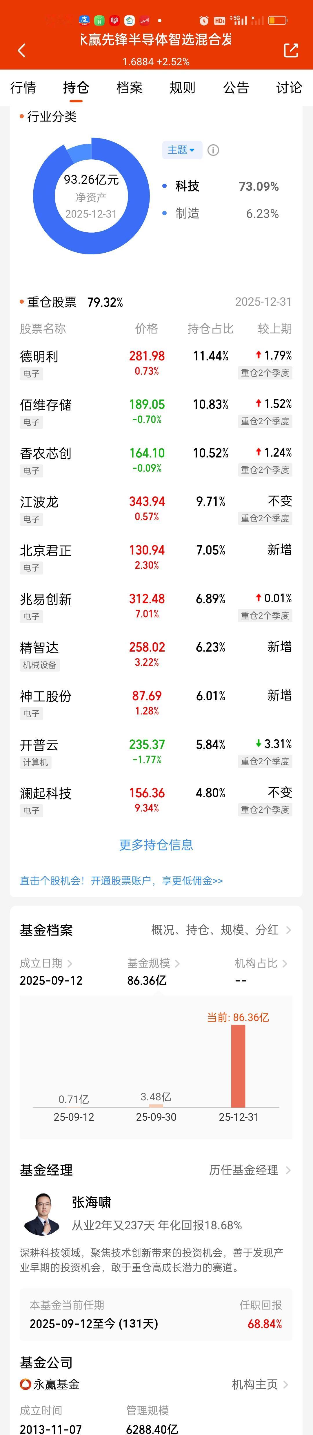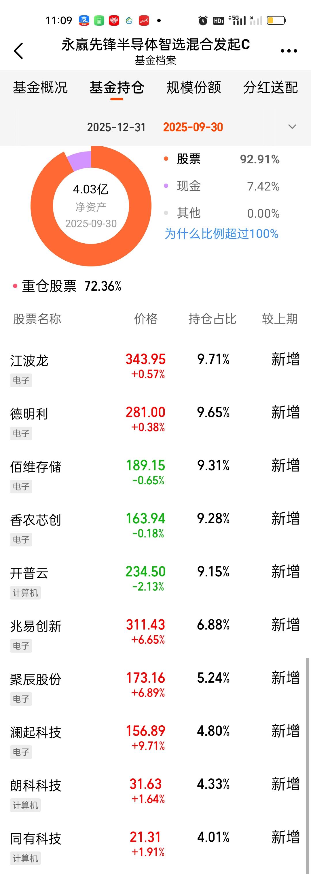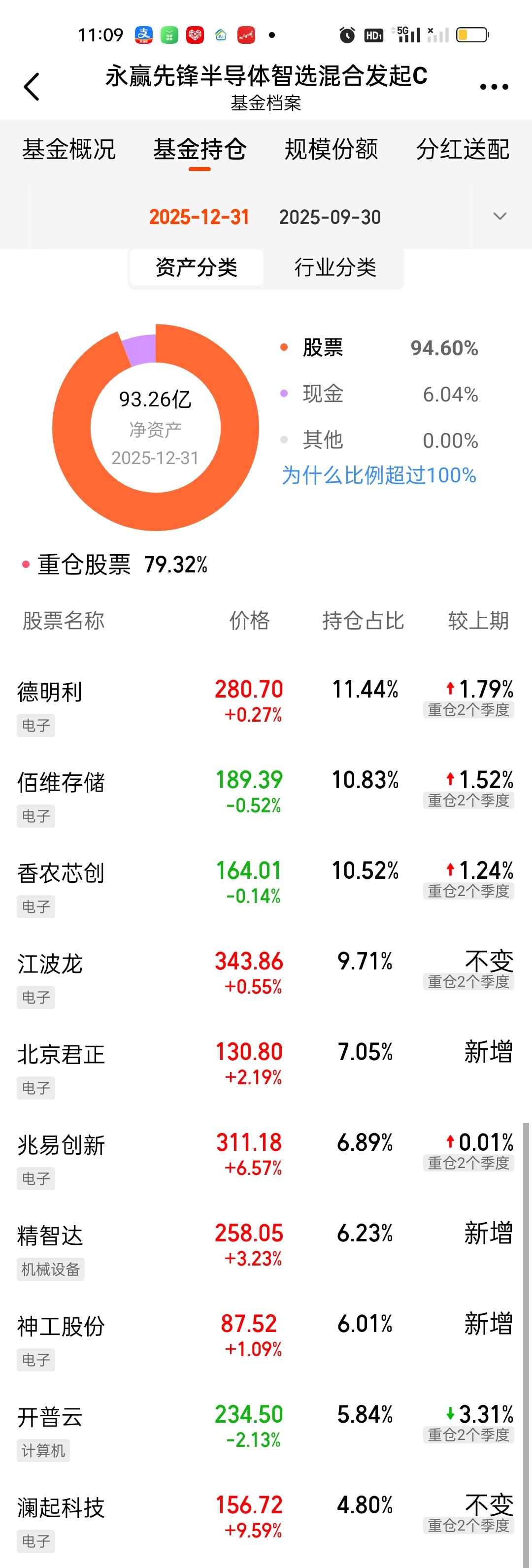 先锋的第四季度持仓今天终于更新了。前十大重仓股占比从72.36%提升到了79.32%,提升了7%,这个提升幅度还是挺大的。持仓风格也足够激进。新增了北京君正,精智达,神工股份三只个股。江波龙从第一重仓股调整到了第四重仓股,持股比例不变。原来第二到第四的德明利,佰维存储,香农芯创升到了第一至第三。持股比例也分别提升了1.79%,1.52%,1.24%。开普云的持股比例大幅下降。 最新持仓和东方阿尔法科技智选相比,有6只相同,不同的4只是,阿尔法科技:普冉股份,聚辰股份,东芯股份,晶合集成。先锋:精智达,神工股份,开普云,澜起科技。从收益率来看,东方阿尔法科技的表现反超了永赢先锋。但领先优势并不大,只领先了0点几。