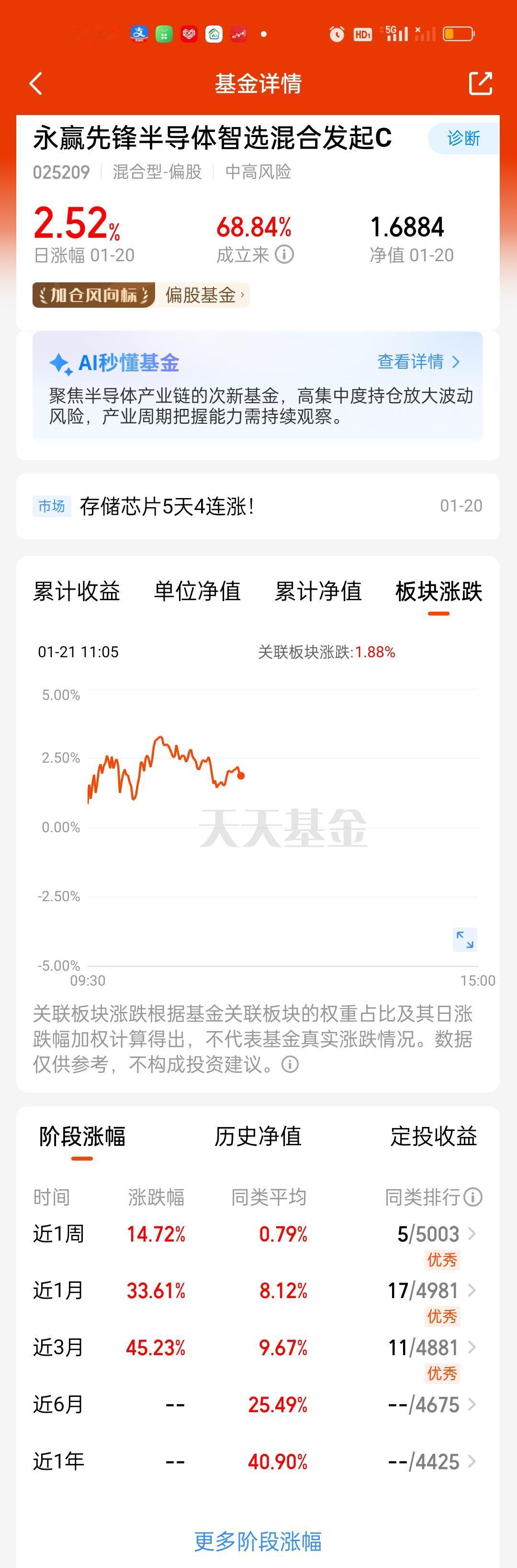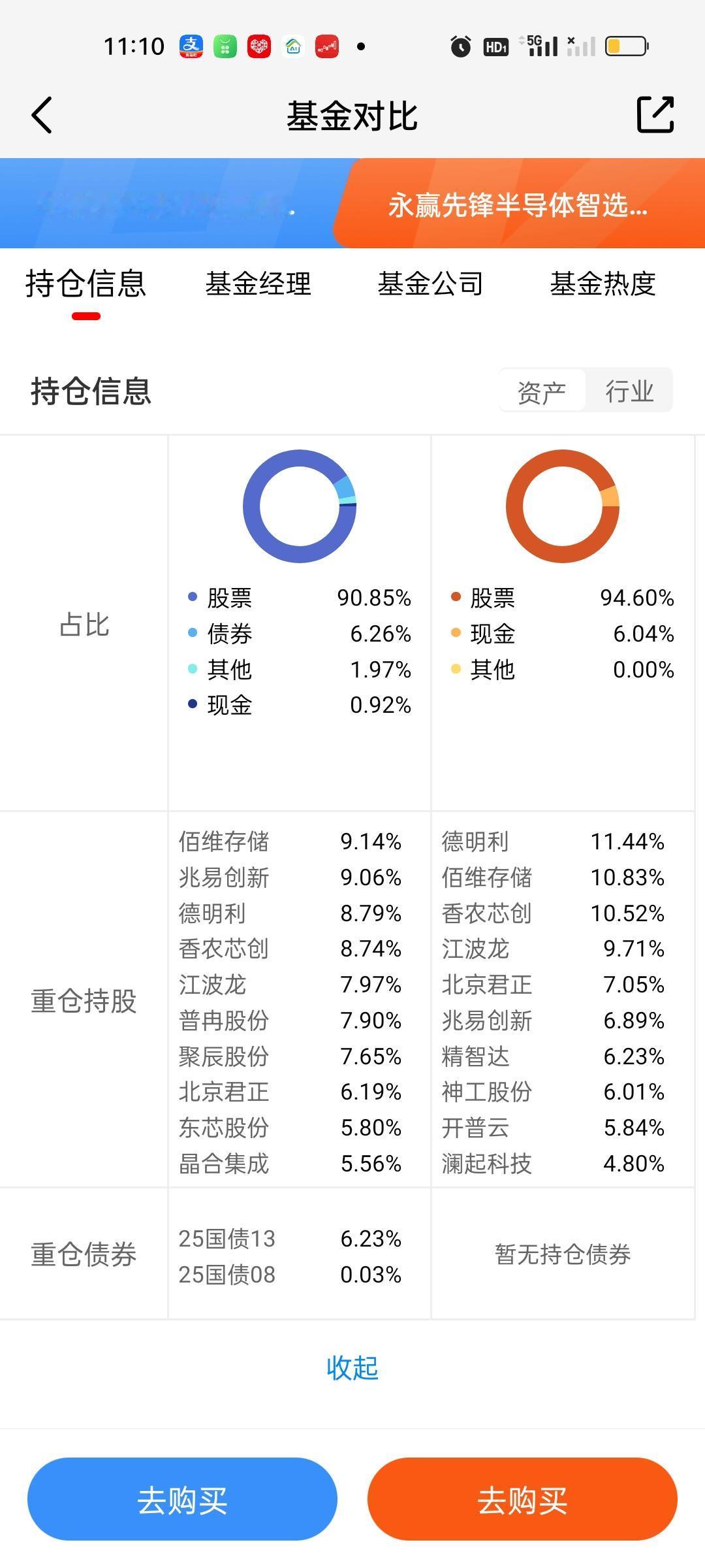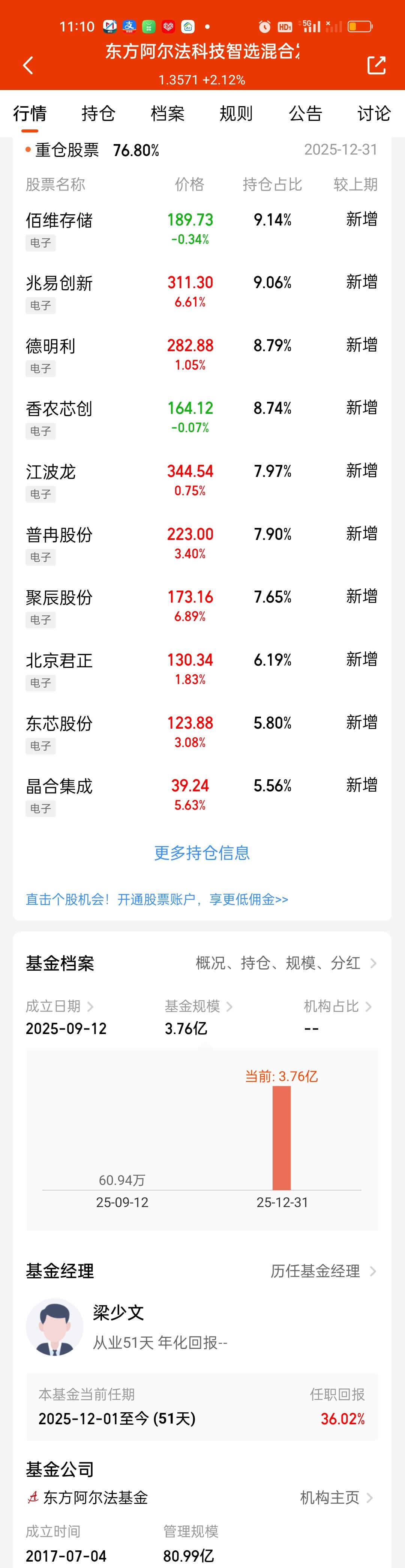 先锋的第四季度持仓今天终于更新了。前十大重仓股占比从72.36%提升到了79.32%,提升了7%,这个提升幅度还是挺大的。持仓风格也足够激进。新增了北京君正,精智达,神工股份三只个股。江波龙从第一重仓股调整到了第四重仓股,持股比例不变。原来第二到第四的德明利,佰维存储,香农芯创升到了第一至第三。持股比例也分别提升了1.79%,1.52%,1.24%。开普云的持股比例大幅下降。 最新持仓和东方阿尔法科技智选相比,有6只相同,不同的4只是,阿尔法科技:普冉股份,聚辰股份,东芯股份,晶合集成。先锋:精智达,神工股份,开普云,澜起科技。从收益率来看,东方阿尔法科技的表现反超了永赢先锋。但领先优势并不大,只领先了0点几。