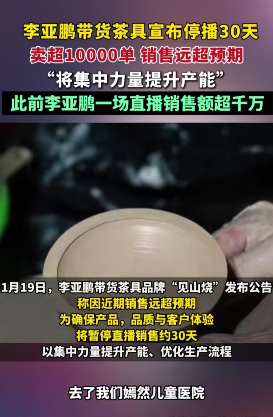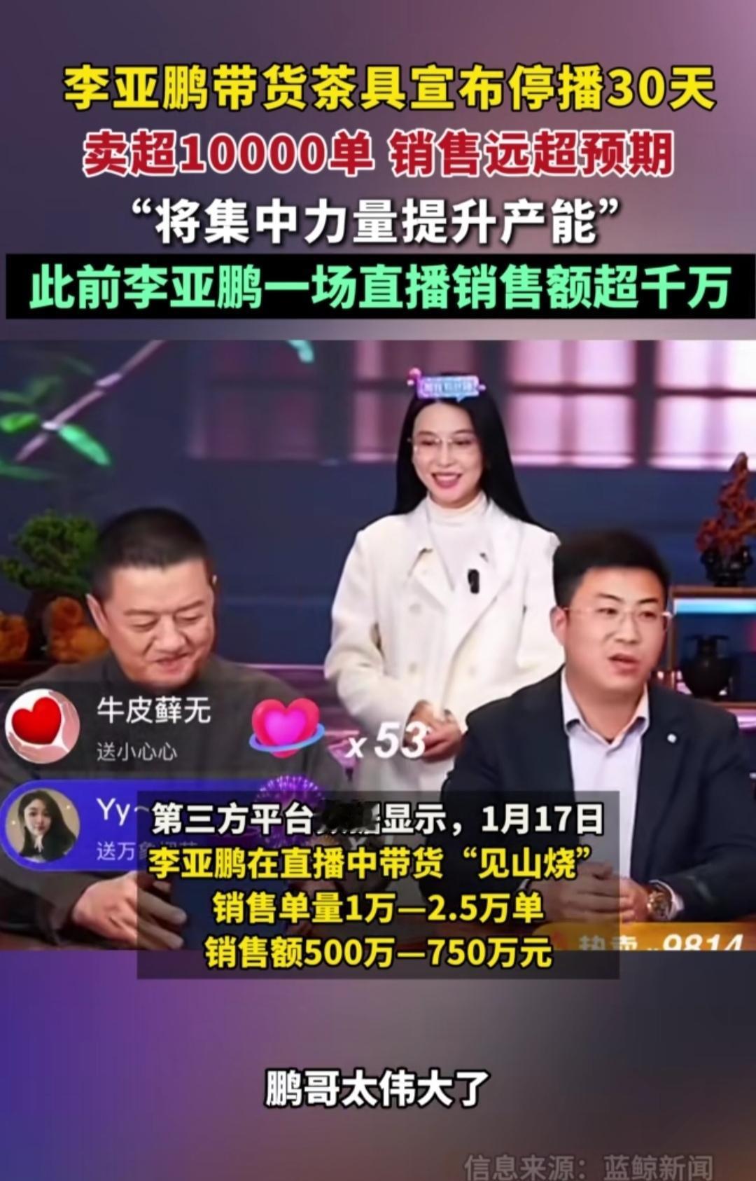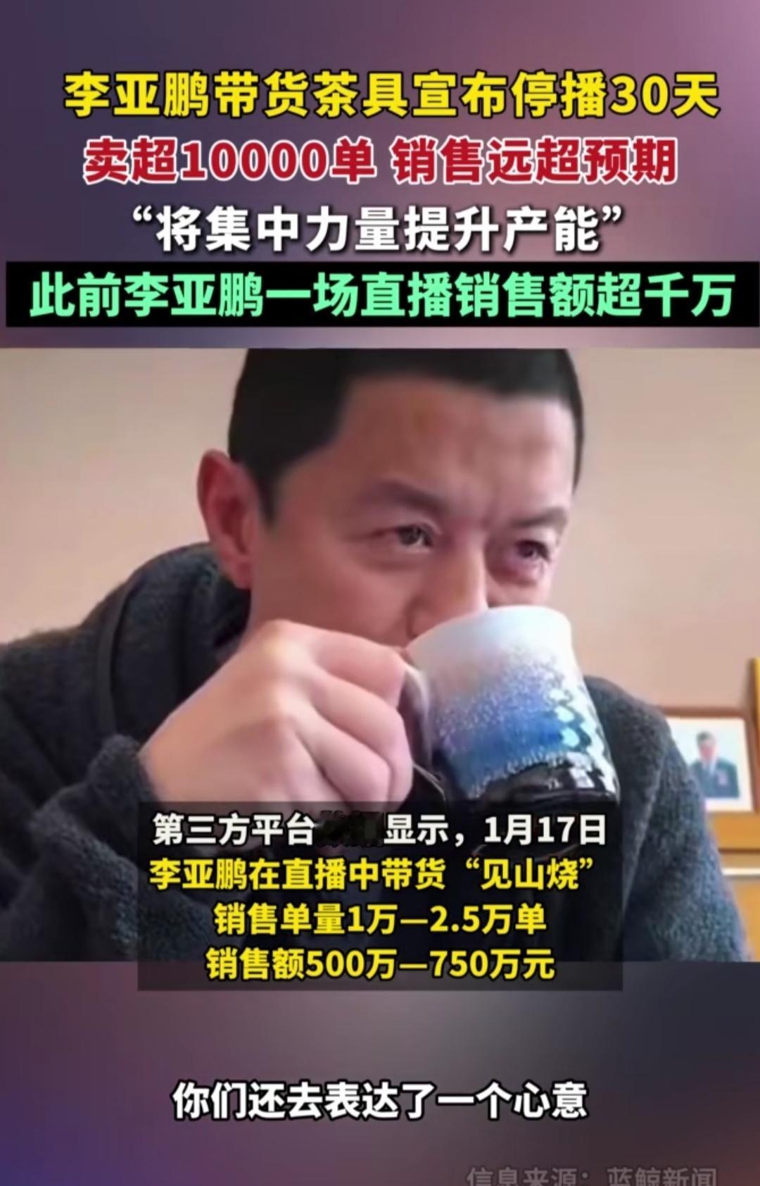 谁能想到李亚鹏茶具直播卖爆1万单后,突然官宣停播30天?这操作直接让网友懵了——