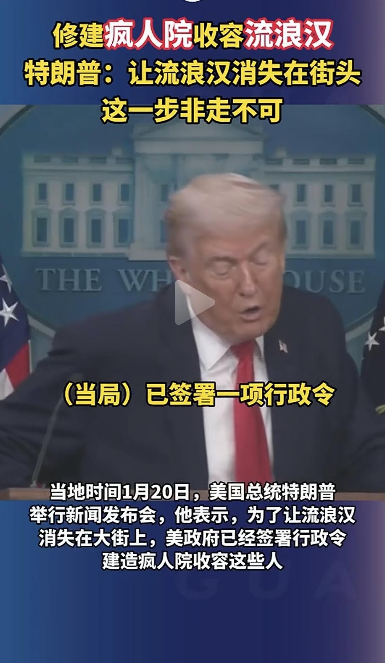 牢A揭露了美国流浪汉的残酷遭遇,特朗普坐不住了,有什么妙招解决流浪汉? 不得不佩服特朗普聪明,美国为了解决流浪汉的问题,当地时间1月20日,美国总统特朗普举行新闻发布会,他表示,为了让流浪汉消失在大街上,美政府已经签署行政令,建立疯人院,将流浪汉关进疯人院。 看来牢A说的都是真的,特朗普脸挂不住了,那么多流浪汉摆在街面上,影响了美国民主灯塔的形象,他们最好的办法就是将这些流浪汉关进疯人院,流浪汉不是疯人,特朗普却把他们当成疯人,集中将流浪汉关进疯人院里,好处多多,外国人再想看到流浪汉,看不到了,满大街的繁华呈现在人们的面前。 最主要的是,这些流浪汉都是无家可归者,他们不是疯人,却当成疯人。集中关在一起,那些医疗机构?那些医学院?那些……?一些事情就不好说了。反正他们都是疯人。想怎么物理消失就怎么物理消失,世人更不知道了,那里面隐蔽安全,即使再出现第二牢A也拍不到鲜活的案例了,不得不佩服特朗普,这一招做的很厉害。