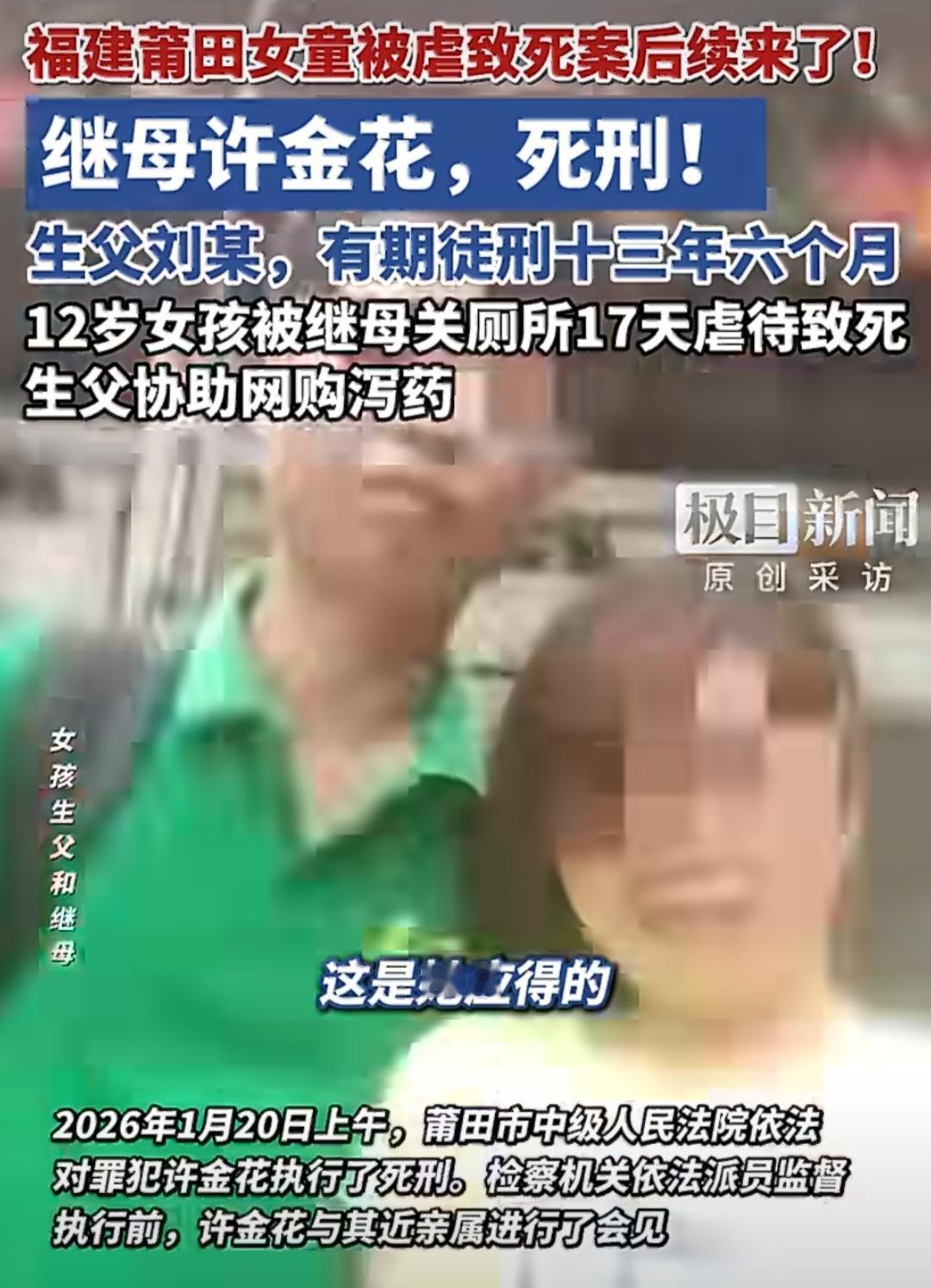 福建莆田那个让人揪心的12岁女孩被虐待致死的案子,终于有了最终的结果,那个把孩子折磨致死的继母许金花被依法执行了死刑。听到这个消息,最难过的还是孩子的生母白女士,她得知消息后说,许金花是偿命了,但自己的女儿琪琪永远回不来了,那个本该拥有绚烂人生的孩子,就这样被夺走了生命,这笔人命债怎么也还不清。 事情的起因是琪琪曾经离家出走,这可彻底激怒了继母许金花。她直接把琪琪手脚捆绑起来,关在了卫生间里,这一关就是整整17天。期间许金花还联系了琪琪的生父刘江,说琪琪总出去闯祸丢了她的脸,让刘江回家教训女儿。刘江回家后真的拿起棍子打了琪琪,打得孩子手和腿上到处都是瘀青,额头还流了血。 在被关卫生间的这些日子里,琪琪遭受的折磨简直让人无法想象。许金花不仅用棍子反复殴打她,还把她的头按在墙上撞,不给她足够的食物和温暖,让她挨饿受冻。更残忍的是,琪琪身上有伤口,许金花竟然把她的伤口泡在脏水里,还用开水去烫她。而作为亲生父亲的刘江,不仅没有阻止这一切,反而帮许金花网购了1600片泻药,看着许金花持续喂给女儿吃。 后来其他孩子发现琪琪身体已经极度虚弱,都劝许金花不要再打了,但许金花根本没有收手。直到琪琪全身抽搐,许金花才把她松绑拖到卧室,换掉带血的衣服,还特意清洗了卫生间,删掉了客厅的监控。可这些掩盖罪行的举动,终究没能逃过法律的制裁。经过法医鉴定,琪琪是因为长期营养不良,再加上严重的外伤、伤口化脓感染,还有饥饿和寒冷等多种因素,最终导致急性循环功能衰竭死亡,孩子身上光是陈旧性损伤就有十多处。 法院审理后发现,许金花长期虐待家里的几个孩子,除了琪琪,还有另外两个被她收买的孩子也遭受过殴打辱骂,甚至被逼迫互相殴打。许金花还曾在网上搜索虐待孩子的方法,主观恶性极大。一审法院以故意杀人罪和虐待罪判处许金花死刑,生父刘江因为参与虐待、提供泻药,还故意伤害琪琪,被判处五年六个月有期徒刑。后来许金花和刘江都提起了上诉,二审法院维持了许金花的死刑判决,还认为刘江原判量刑太轻,启动了审判监督程序,最终把刘江的刑期改判为十三年六个月,剥夺政治权利二年。 直到许金花被执行死刑,这起令人发指的案件才算画上了句号,但留给受害人家属的伤痛,可能一辈子都无法愈合。虐待继女致死案