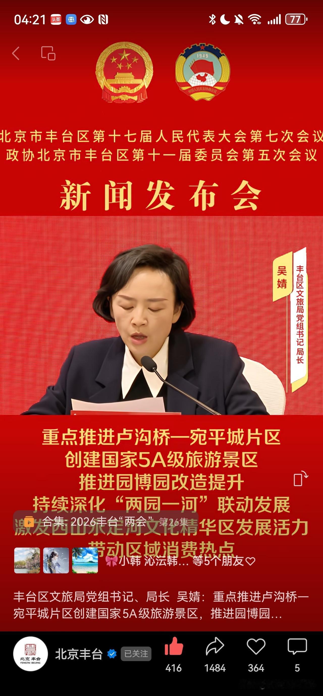 卢沟桥宛平将建成五A级景区,“两园一河”联动发展,五大工程助推园博园周边区域成为丰台区乃至北京市重点打造的新的消费热点。 日前结束的丰台区两会召开新闻发布会。丰台区文旅局局长吴靖介绍了丰台区政府新年打算,听后鼓舞人心。前两年还在纸面上的计划,如今五大在建工程如火如荼: 一是人大附中和北京十二中的工程已经完工大半,都将在今年九月份交付使用。 二是合生汇工程已出地面,2027年交付使用已无悬念。 三是地铁一号线延长线明年三月份建成通车,届时将和十四号线汇聚张郭庄站(一号线在园博园三号门对面设一站)。 四,在中关村丰台园区“创新中心”一期工程交付使用的基础上,二期工程也已即将完成地下施工,四座塔吊高高轰立。 五,紧邻合生汇的国家直属机关职工宿舍楼三期工程已经大面积推开。 据悉,在房价动荡的当下,只有园博府、西山甲一号、西悦晴翠等区域的房价下调幅度不大。