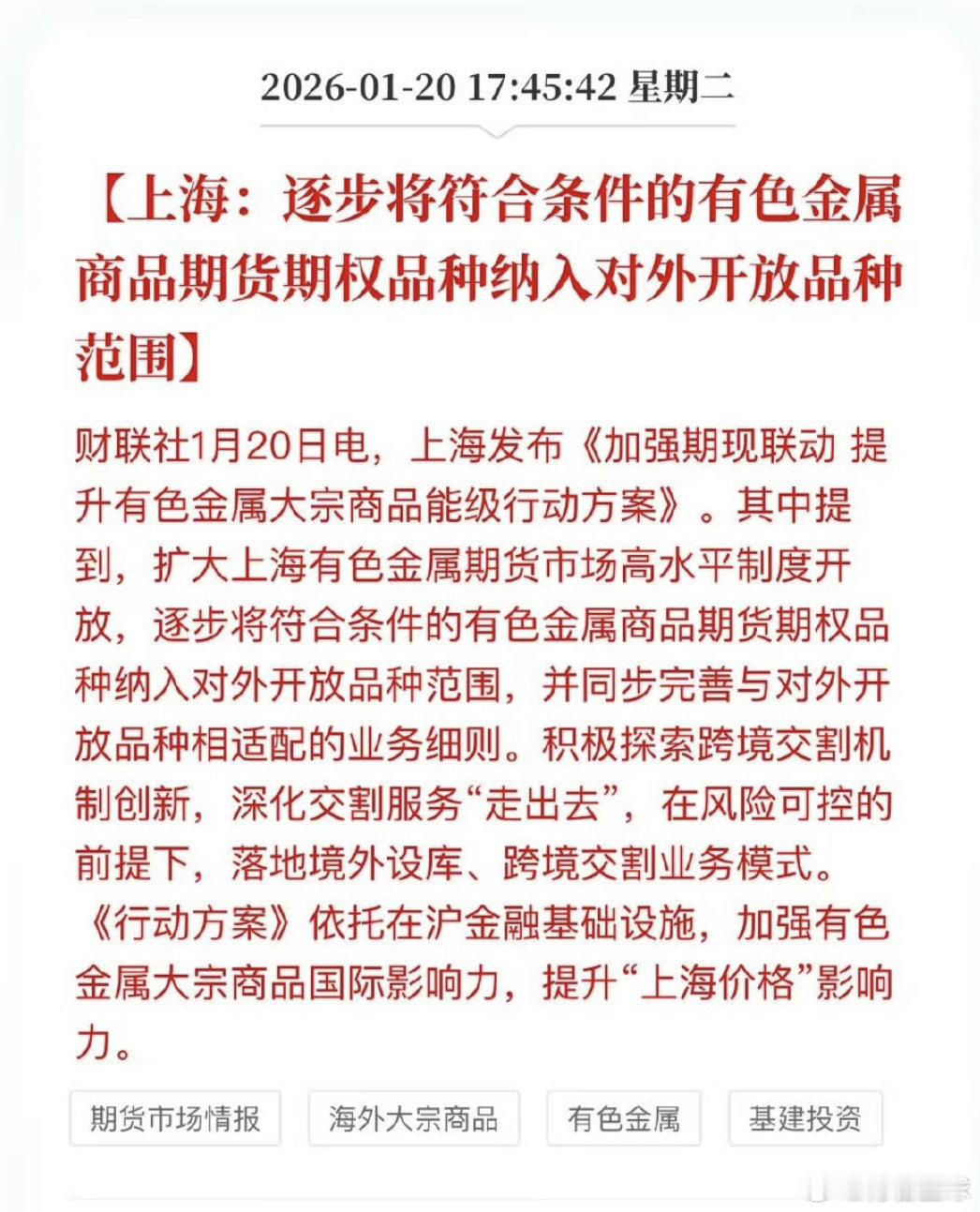 有色金属长期利好这个政策对相关品种(如白银、铜、铝等)整体是明确的长期利好,同时也会带来短期情绪催化。一、长期核心利好逻辑1. 提升定价权与全球影响力政策推动“上海价格”走向国际,意味着国内有色金属期货价格将更深度地影响全球定价。对于白银、铜这类国内供需与全球市场高度关联的品种,这会增强“中国需求”在全球定价中的权重,长期来看有助于国内产业端规避国际价格波动风险。2. 改善流动性与市场深度引入境外机构和资金参与交易,会显著提升市场流动性,减少因资金容量不足导致的极端波动(比如此前沪银的单边暴涨)。同时,更多产业客户参与套保,也会让期货价格更贴合真实供需,增强价格发现功能。3. 缓解内外盘供需割裂跨境交割、境外设库的探索,有助于打通国内与国际的实物流通渠道。以白银为例,此前沪银与伦敦银的高溢价(最高超10美元/盎司)正是因为跨境流动受阻,政策落地后套利空间将逐步收敛,国内品种的价格稳定性会提升。二、短期情绪催化- 政策发布后,市场会预期境外资金流入、品种活跃度提升,短期可能推动相关品种(尤其是白银、铜)的价格出现情绪性上涨。- 对于此前因“内强外弱”导致的沪银高溢价,政策会缓解市场对“流动性不足”的担忧,短期溢价可能小幅收窄,但国内实物短缺的支撑仍会让沪银维持相对强势。三、分品种影响差异- 白银:受益最直接。国内光伏、电动车的工业需求爆发,叠加政策提升定价权,沪银的国际关注度会显著提高,长期吸引更多配置资金。- 铜:国内是全球最大铜消费国,政策强化“上海铜价”的全球锚定作用,有助于产业端更高效地进行套保,减少国际资本对铜价的单边操控风险。- 铝、镍等工业金属:同样会因市场开放和定价权提升而受益,尤其是国内有产能优势的品种,将进一步巩固全球定价中的“中国话语权”。总结这一政策本质是通过制度开放,让上海有色金属期货市场从“国内定价”走向“全球定价”,对相关品种的长期流动性、定价效率、产业服务能力都是重大利好,短期也会带来情绪面的积极催化。