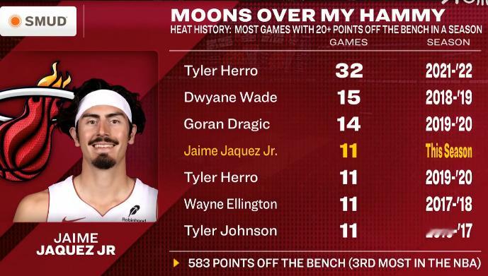 热火队史:单赛季替补出场砍下20+得分场次最多球员泰勒·希罗 —— 32 场(2021-22 赛季)德维恩·韦德 —— 15 场(2018-19 赛季)戈兰·德拉季奇 —— 14 场(2019-20 赛季)哈梅·哈克斯 —— 11 场(本赛季,共砍下583 分(NBA 第 3 多))泰勒·希罗 —— 11 场(2019-20 赛季)韦恩·艾灵顿 —— 11 场(2017-18 赛季)泰勒·约翰逊 —— 11 场(2016-17 赛季)热火vs国王迈阿密热火