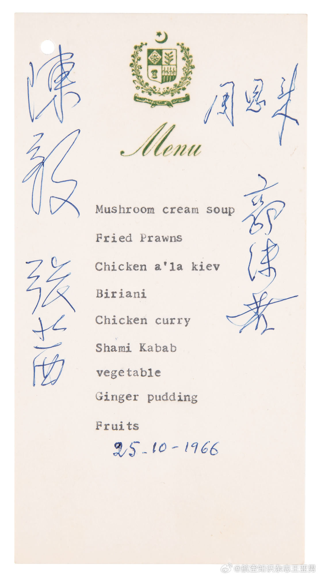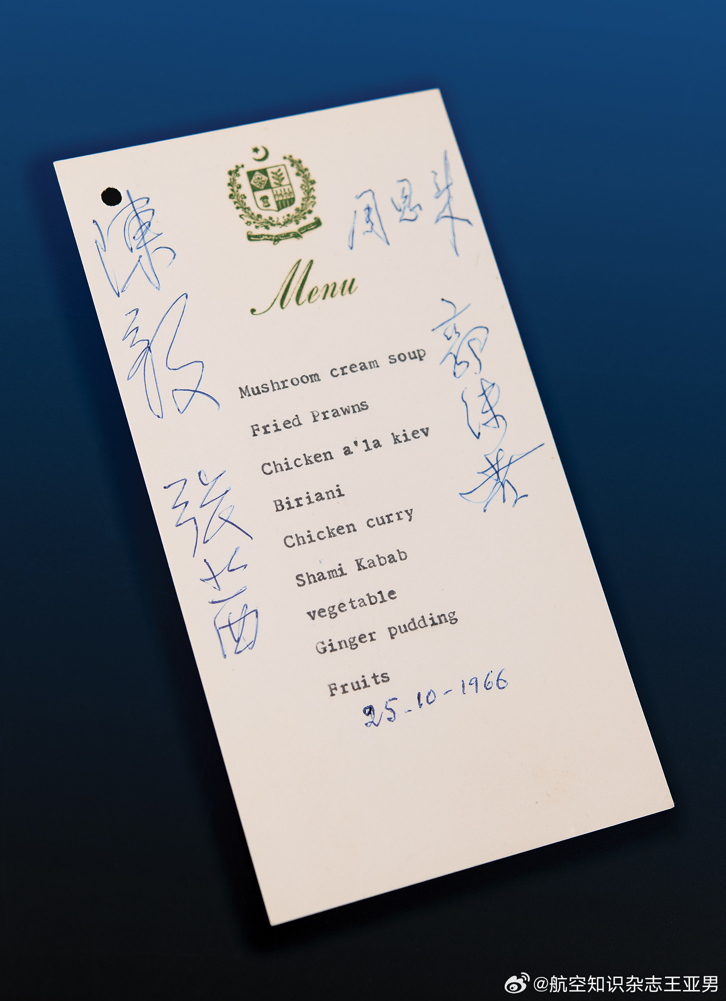 今天在国内文献收藏市场上,你几乎不可能找到党和国家领导人的签名文件——按照规定,这类文件都要归档保存,不大可能流入私人手中。但在某些外交场合,党和国家领导人可能为某些国际友人签名留念,所以偶尔你能在海外收藏市场上找到这类真迹,当然它们的身价通常极高,这并非完全是因为名人效应,还因为这类签名文件本身就是与中国相关的重要国际关系历史的证明。这里这份签名文件实际上是一份菜单,上面的四个签名分别是中国国务院总理周恩来、外交部长陈毅、陈毅夫人张茜和中国科学院院长郭沫若,签名用的是蓝色圆珠笔,显然是宴会上临时使用的书写工具。这次晚宴发生在1966年10月25日,地点是北京。那天巴基斯坦驻华大使苏丹·穆罕默德·汗特别举行宴会,宴请到访中国的巴基斯坦外交部长谢里夫丁·皮尔扎达一行,周恩来、陈毅、张茜和郭沫若等中方人士出席了晚宴。菜单上印有巴基斯坦国徽;菜单列出了“奶油蘑菇汤、炸大虾、基辅鸡、印度咖喱鸡、咖喱鸡、沙米烤肉串、蔬菜、姜汁布丁、水果”等菜品。品相极佳。这是中国和巴基斯坦两国关系发展历程的重要见证,再加上这四个珍贵签名,在海外拍卖市场上的成交价达到了46270美元。